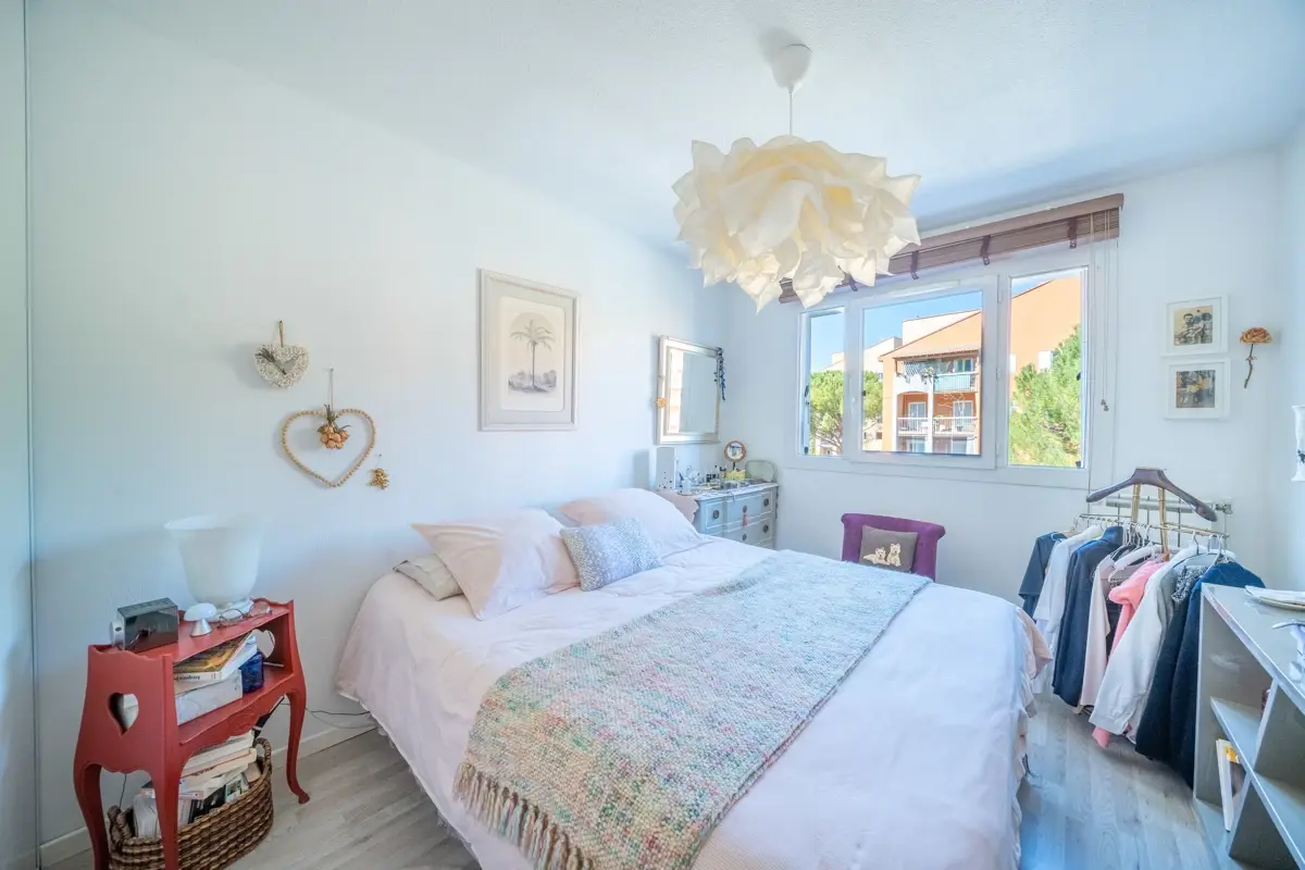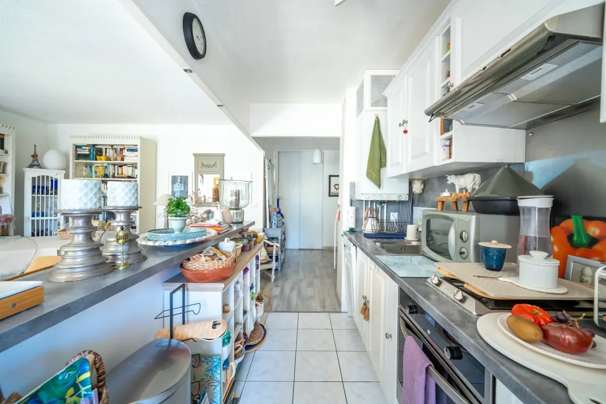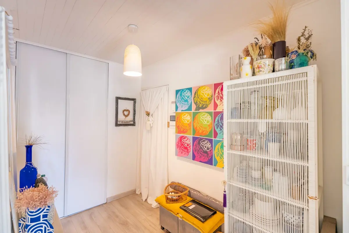 Dès l’entrée, des rangements intégrés optimisent l’espace et apportent une réelle fonctionnalité. La pièce de vie, baignée de lumière naturelle grâce à son exposition plein sud, se compose d’un séjour convivial ouvert sur une cuisine aménagée, créant un espace harmonieux et agréable à vivre tout au long de la journée.
