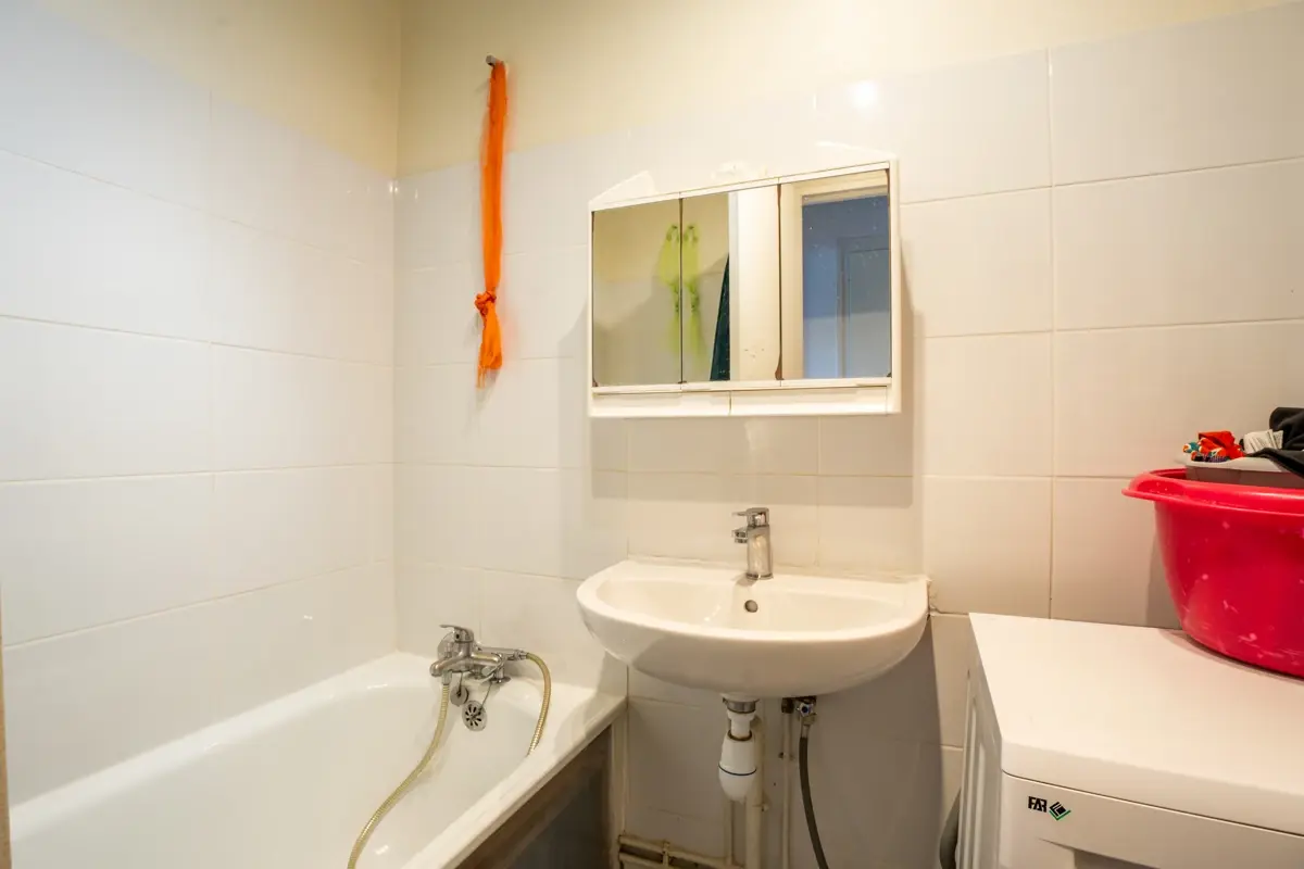 Appartement lumineux au 2e étage de 57 m² avec un séjour, cuisine équipée, deux chambres dont une avec placard intégré, salle de bain, WC séparé, et loggia. Cave privative et local vélo. Chauffage collectif avec répartiteur individuel, eau chaude et froide incluses.