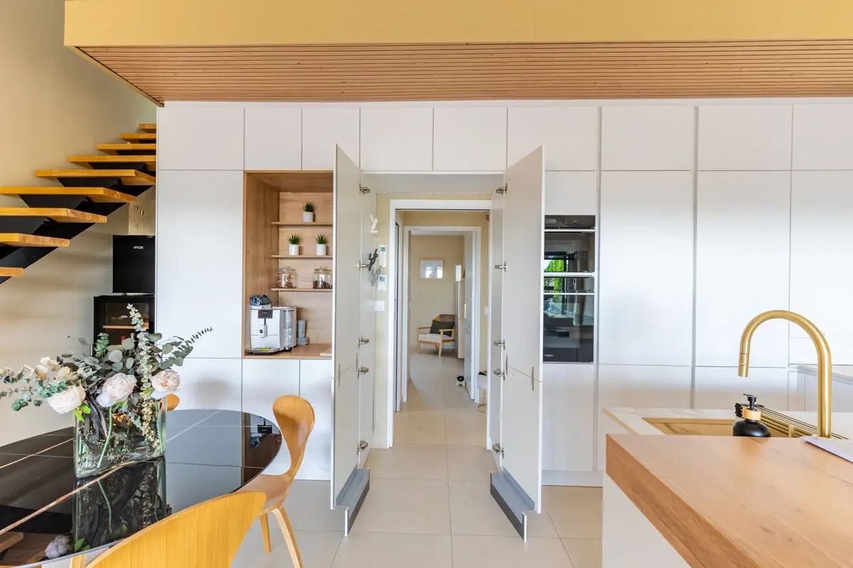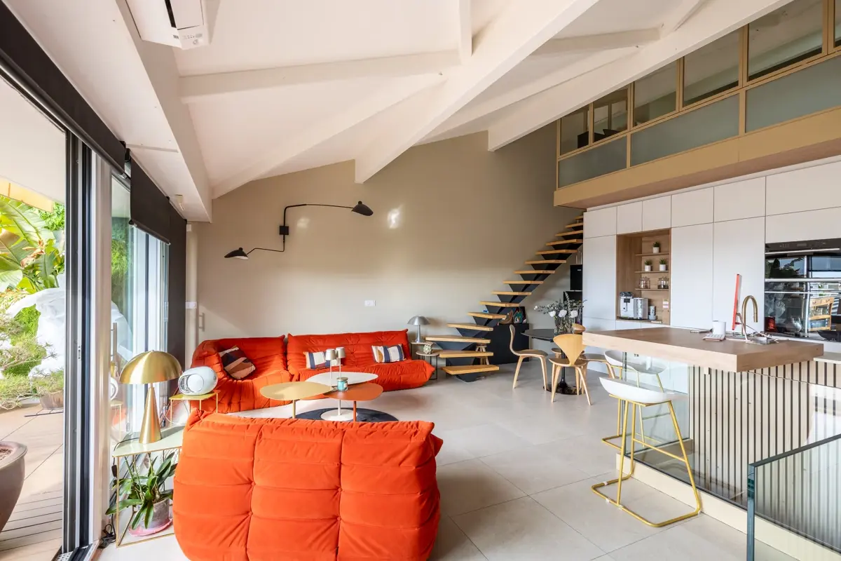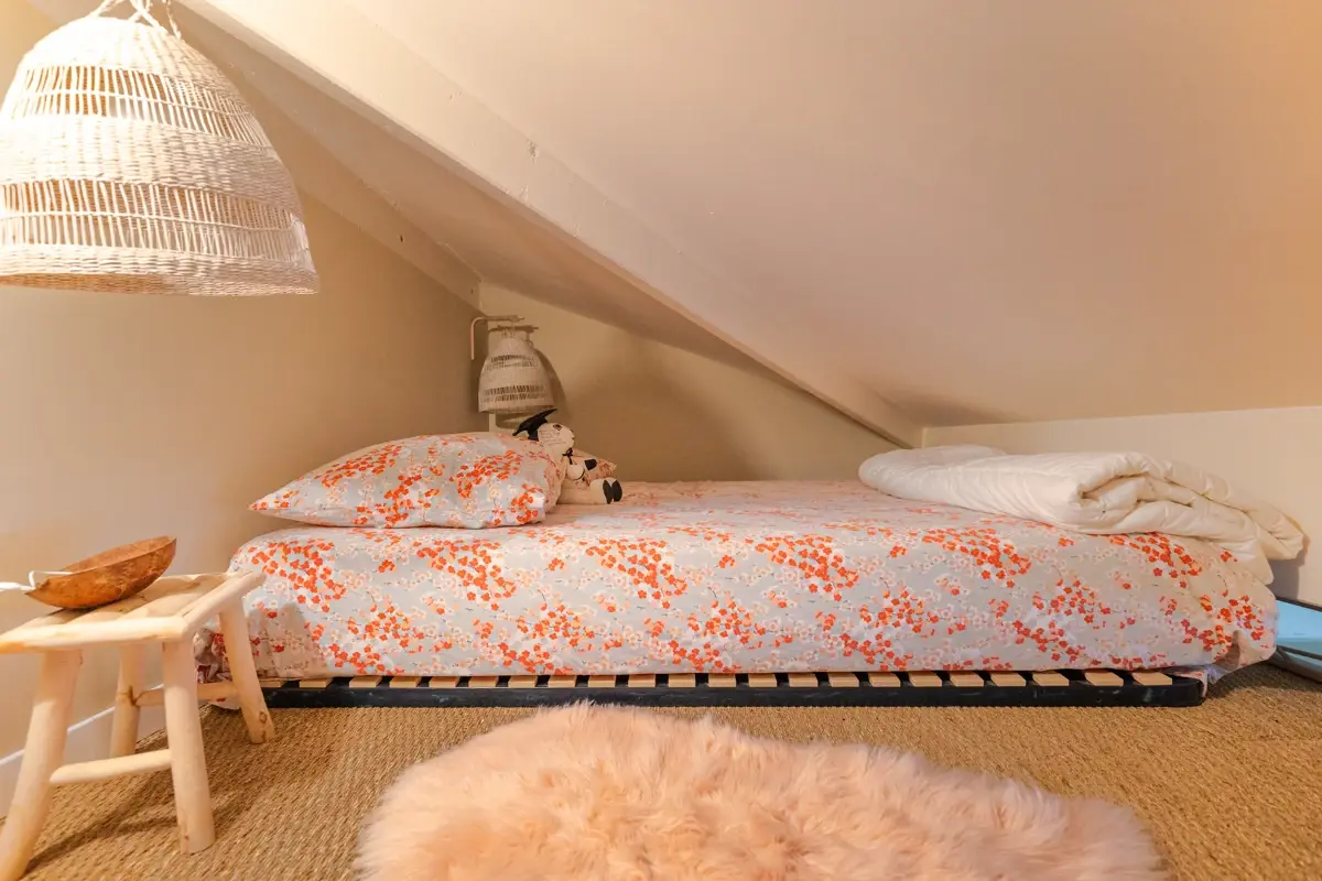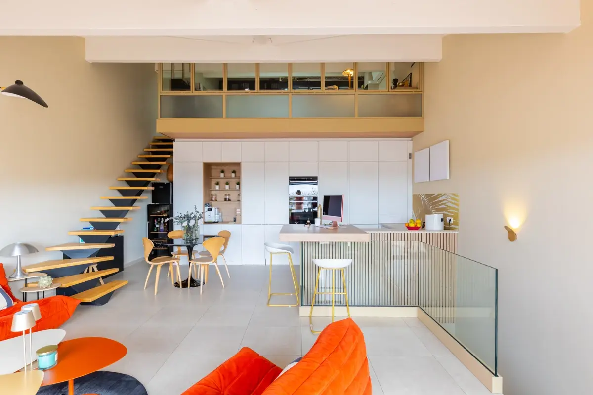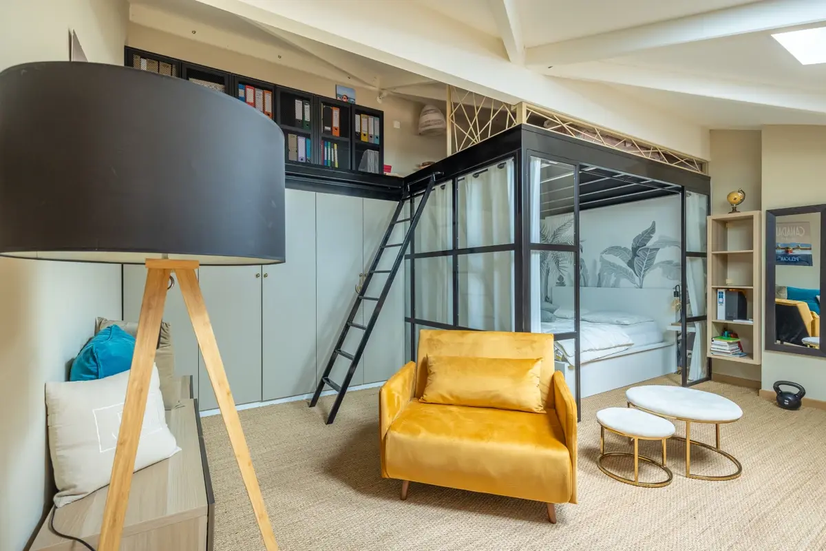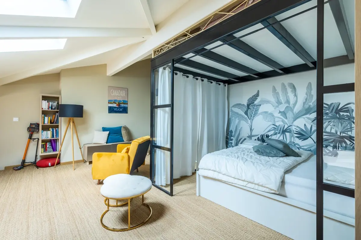 On trouve également une mezzanine aménagée avec une chambre verrière, un espace bureau et une autre mezzanine sur-élevée pour un couchage supplémentaire ou du rangement.
