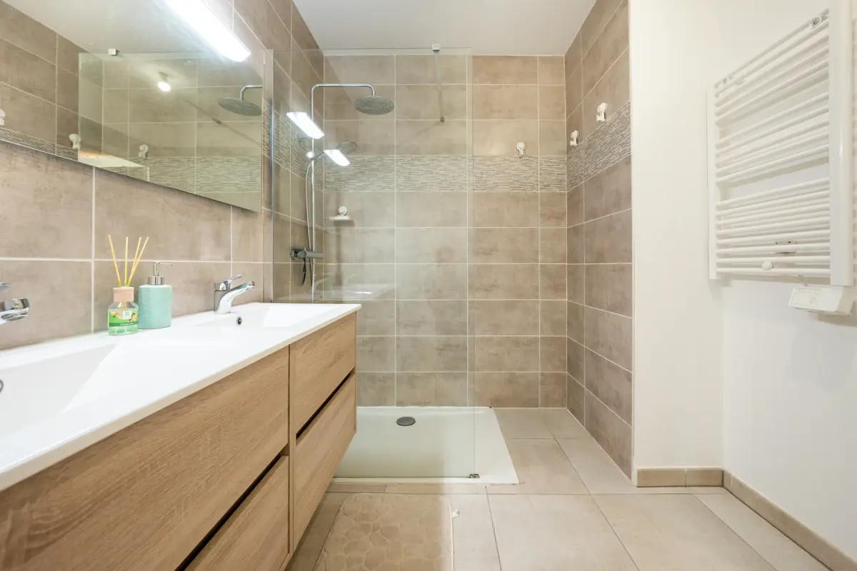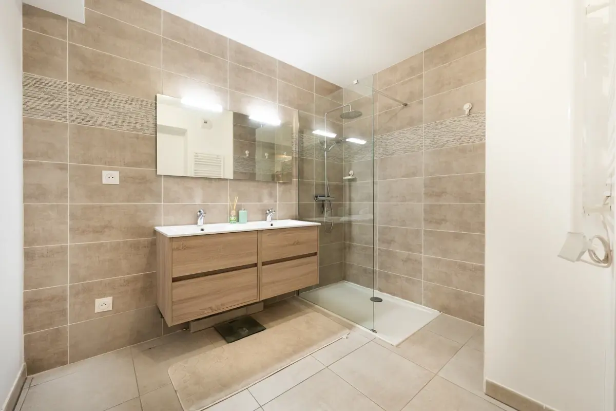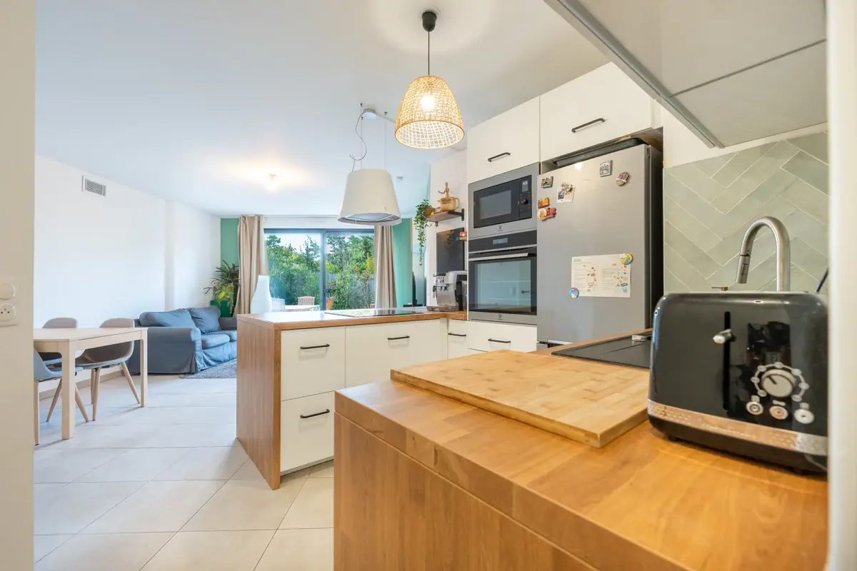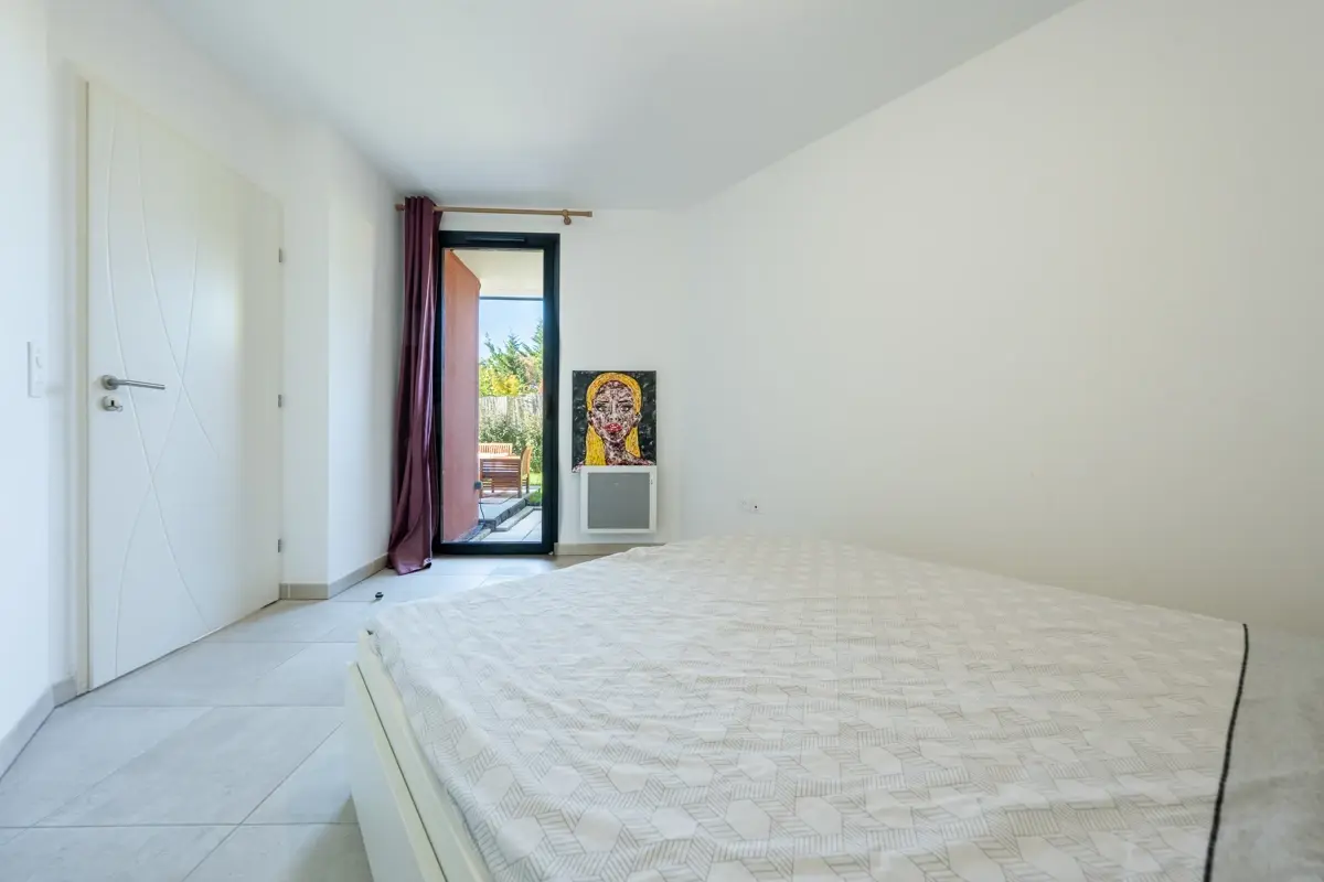 L'appartement dispose d'un aménagement fonctionnel avec une cuisine ouverte moderne, entièrement équipée et aménagée. Le salon s'ouvre sur la terrasse et le jardin. Le coin nuit est composé de trois chambres ayant un accès direct sur le jardin, une salle d'eau avec douche à l'italienne et double vasque, et un WC suspendu séparé.