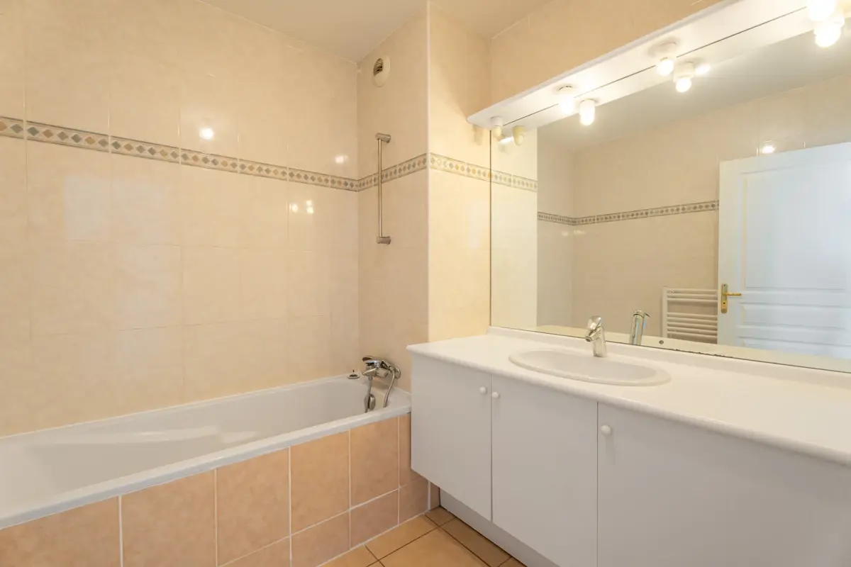 Cet appartement de 76 m² offre un grand séjour baigné de lumière naturelle et une cuisine ouverte moderne. Il dispose de deux chambres confortables, une salle de bains bien agencée et un WC séparé. La terrasse couverte propose une vue apaisante sur les jardins de la résidence. Un double box privatif en sous-sol et un ascenseur complètent ce bien.