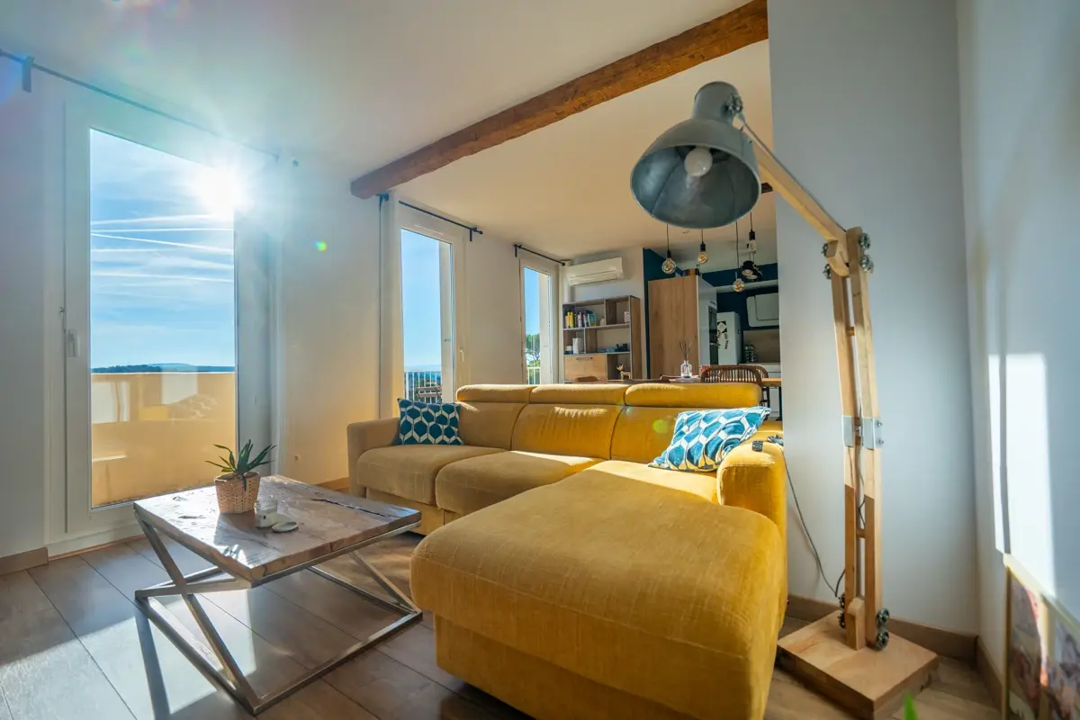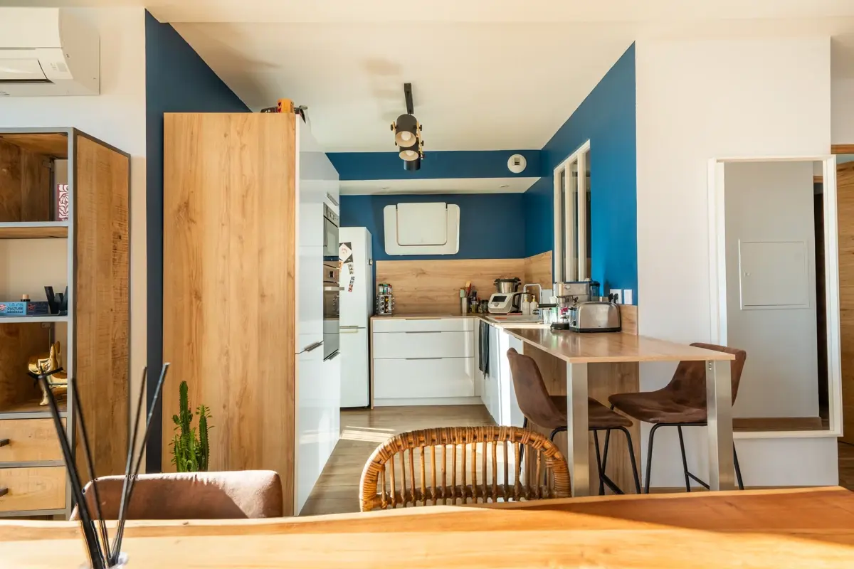 D'une surface d'environ 56 m², cet appartement climatisé dispose d'une grande pièce de vie de 38 m², intégrant un salon lumineux, une cuisine moderne ouverte, et un espace salle à manger. La chambre de 12 m² comprend deux dressings pour un rangement optimal. Une salle de douche à l'italienne et des WC séparés complètent l'intérieur.