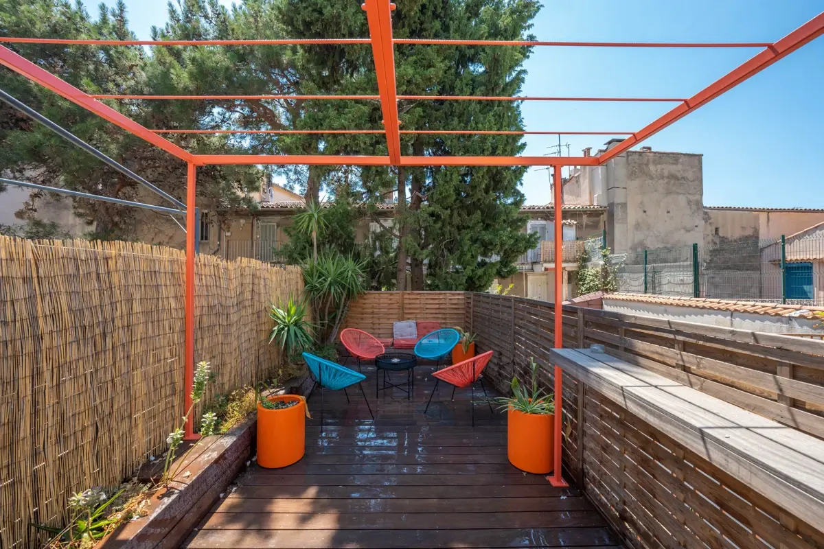 Profitez d'une grande terrasse de 25 m² exposée sud-ouest comprenant une pergola en fer forgé, un espace préservé des regards, parfait pour des moments de détente en plein air avec vue sur les toits d'Aix-en-Provence.