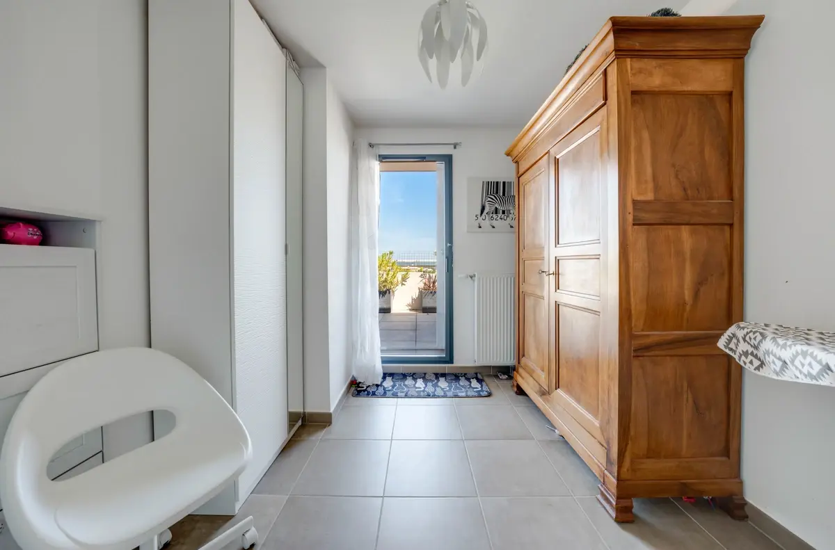 Cet appartement T3 lumineux dispose d'une pièce de vie avec cuisine ouverte, donnant sur une terrasse de 30m² exposée sud-est. La partie nuit comprend deux chambres, chacune avec accès à une terrasse de 20m² nord-ouest, une salle d'eau, une grande salle de bain, et un box fermé de 29m².