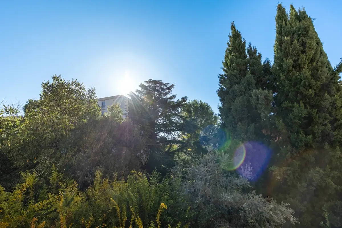 Cet appartement traversant et lumineux propose un séjour climatisé avec balcon et vue sur jardin, une cuisine séparée avec loggia, deux chambres dont une avec balcon, un dressing, une salle d'eau et un WC séparé.