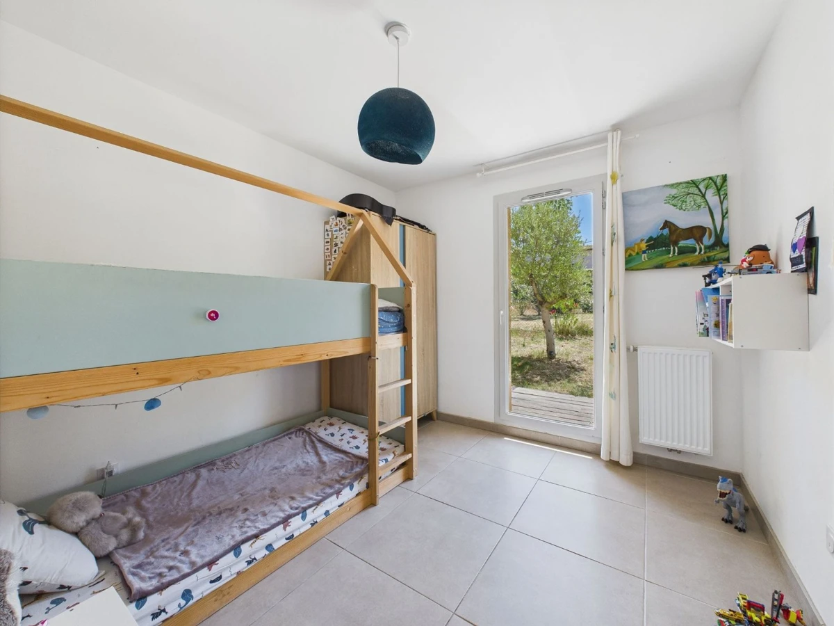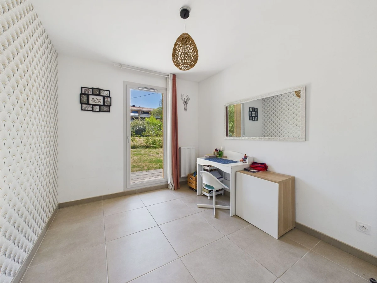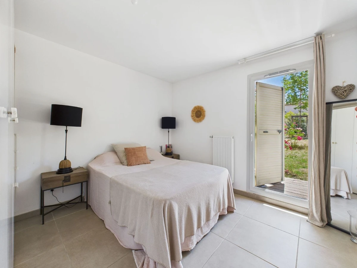 Cet appartement de 88 m² offre un aménagement fonctionnel et lumineux grâce à son orientation plein sud. La pièce de vie spacieuse comprend une cuisine ouverte et est inondée de lumière naturelle grâce à une grande baie vitrée et deux portes-fenêtres. L'espace nuit propose une chambre parentale et deux autres chambres avec accès direct au jardin, dont une avec sa propre salle d'eau. Une salle de bain avec baignoire et un WC séparé complètent l'ensemble.