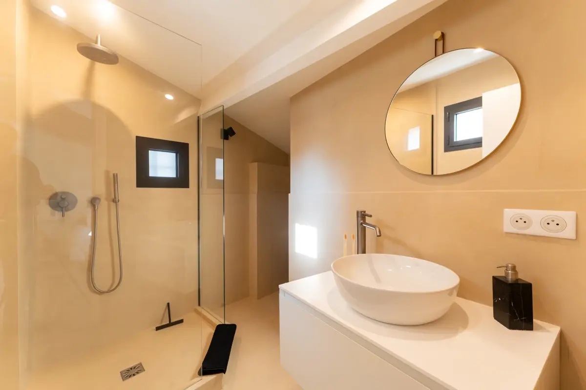 🏡 Description intérieure : Au rez-de-chaussée, les pièces de vie comprennent un salon confortable, une salle à manger éclairée par une grande verrière de toît, et un salon TV séparé par une cloisin en verre.