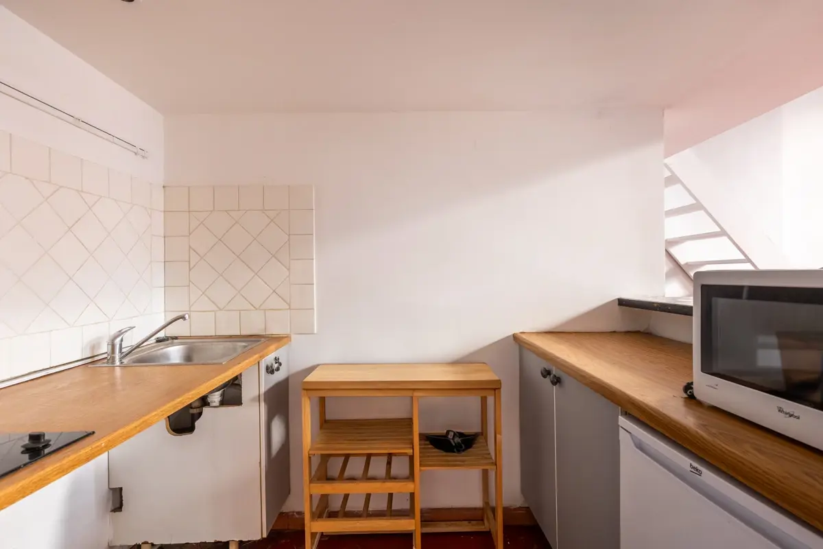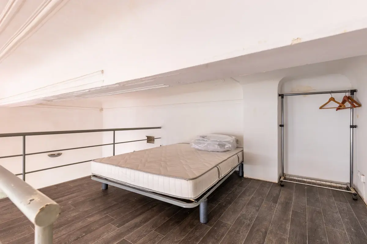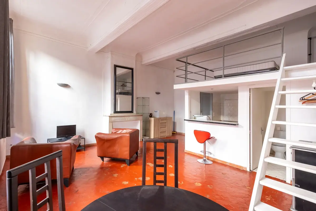 Cet appartement se compose d'une grande pièce à vivre avec une belle hauteur sous plafond, une cuisine ouverte sur le séjour, une salle de bain avec WC ainsi qu'une mezzanine.