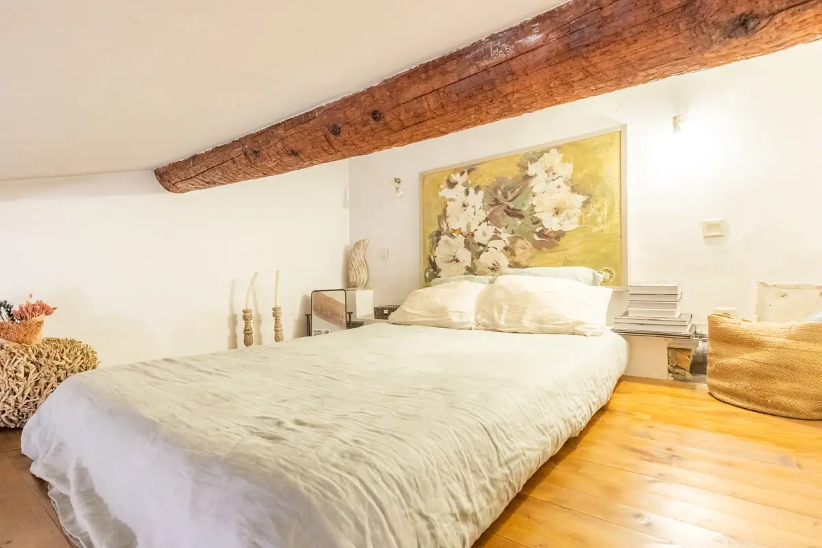 Tout le charme de l'ancien est à retrouver dans ce bien atypique, avec notamment une salle d'eau et buanderie à l'étage, plafonds rampants avec poutres apparentes dans la pièce de vie.