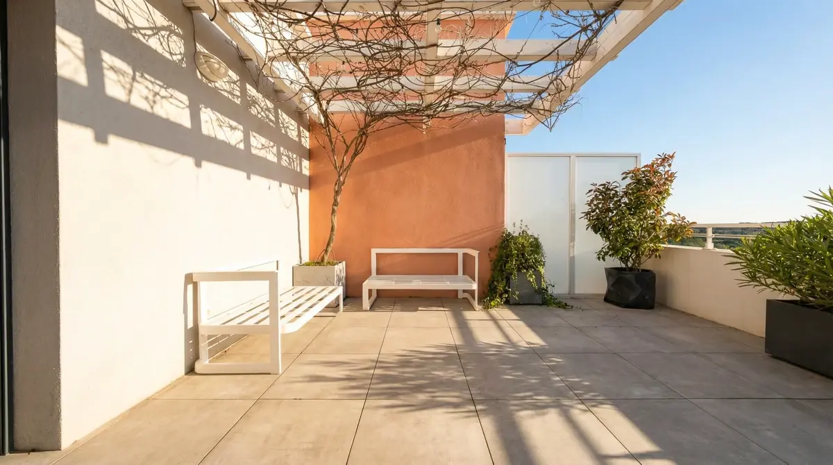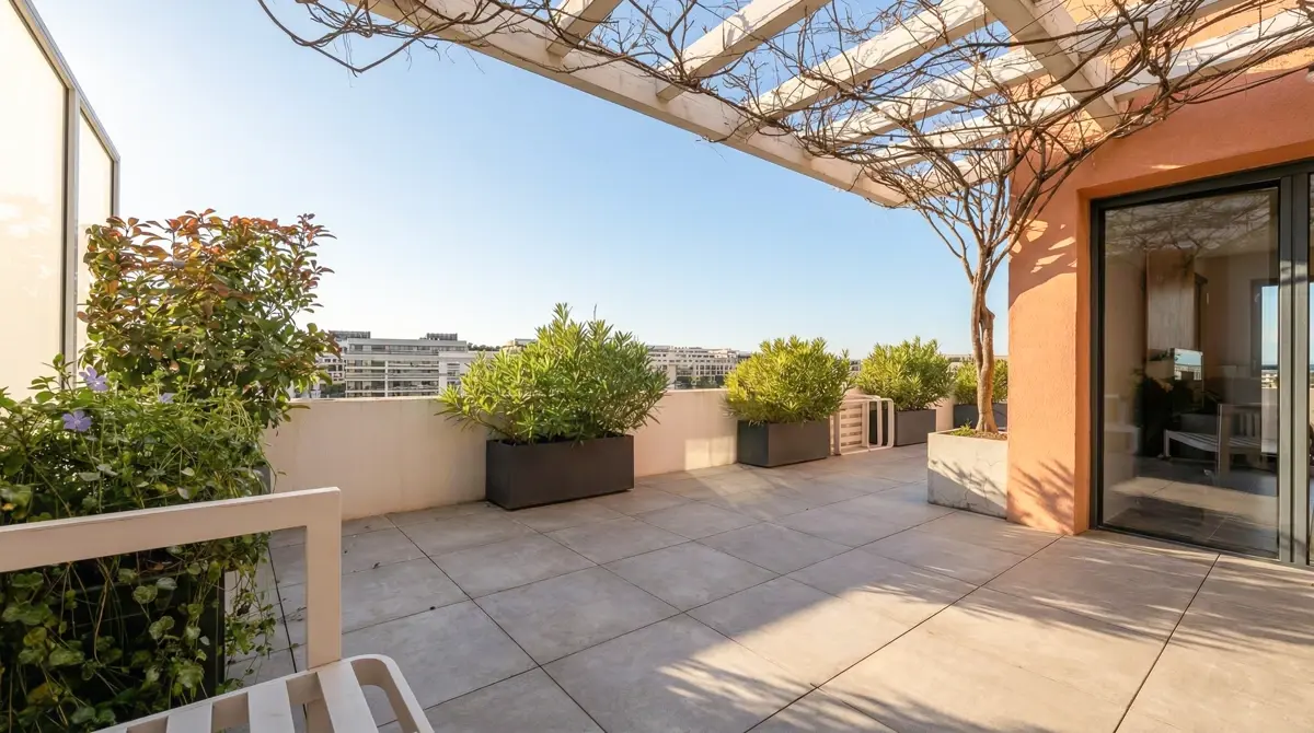 La grande terrasse de 69 m² est orientée sud‑ouest avec pergola, offre une vue dégagée et sans vis‑à‑vis.