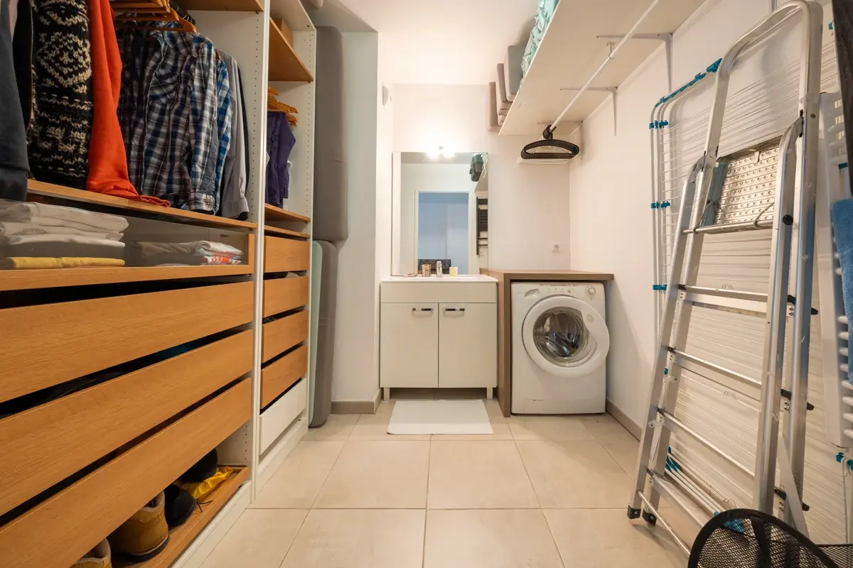 Le couloir avec de nombreux rangements dessert les 3 chambres, la salle d’eau, et des WC séparés et un espace buanderie.