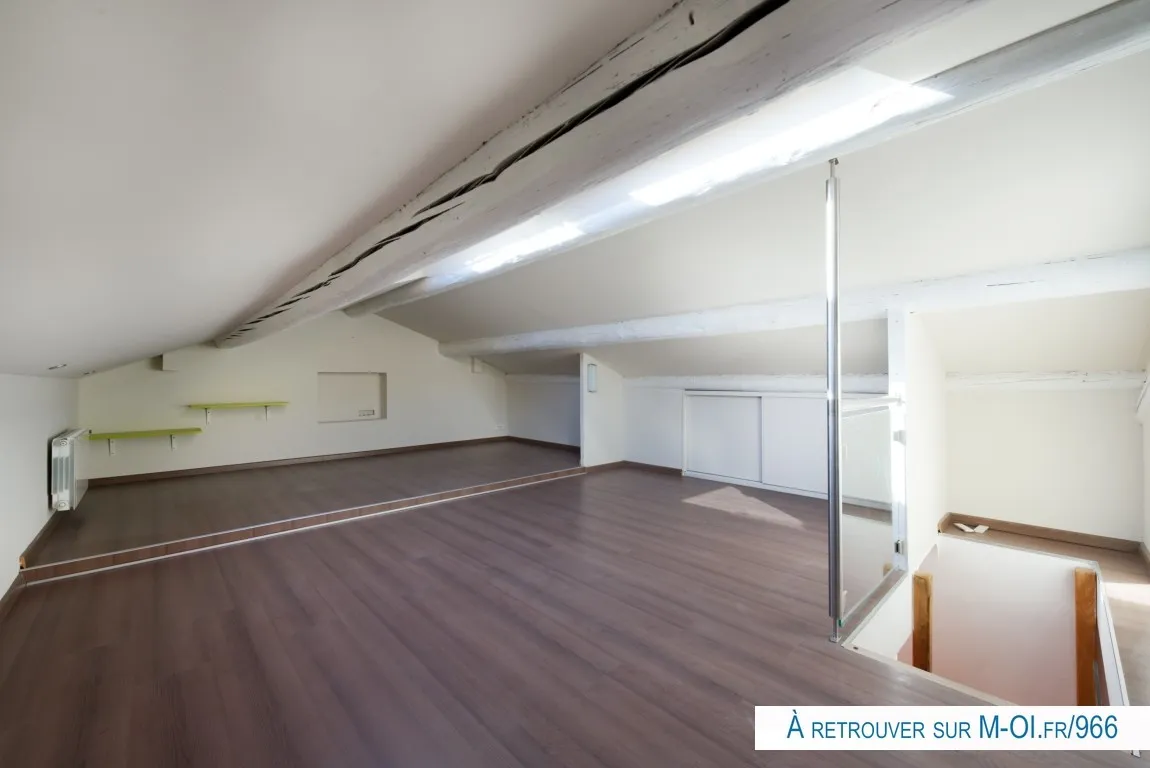 L'étage, mansardé, propose quant à lui 20 m² (hauteur sous plafonds à moins de 1m80), et possède deux véluxs,