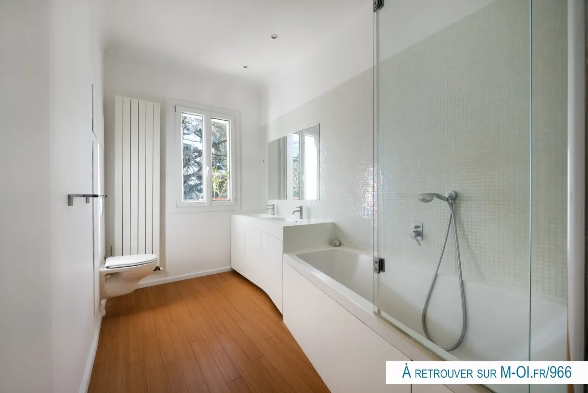 La salle de bain propose une baignoire, double vasque, bamboo au sol, wc suspendu, et possède une belle ouverture à l'est !