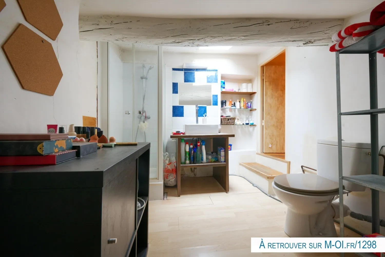 Une vaste chambre très cosy agrémentée de rangements est également proposée (hauteur sous plafonds inférieure à 1m80), ainsi qu'une salle d'eau et WC éclairés par un velux,