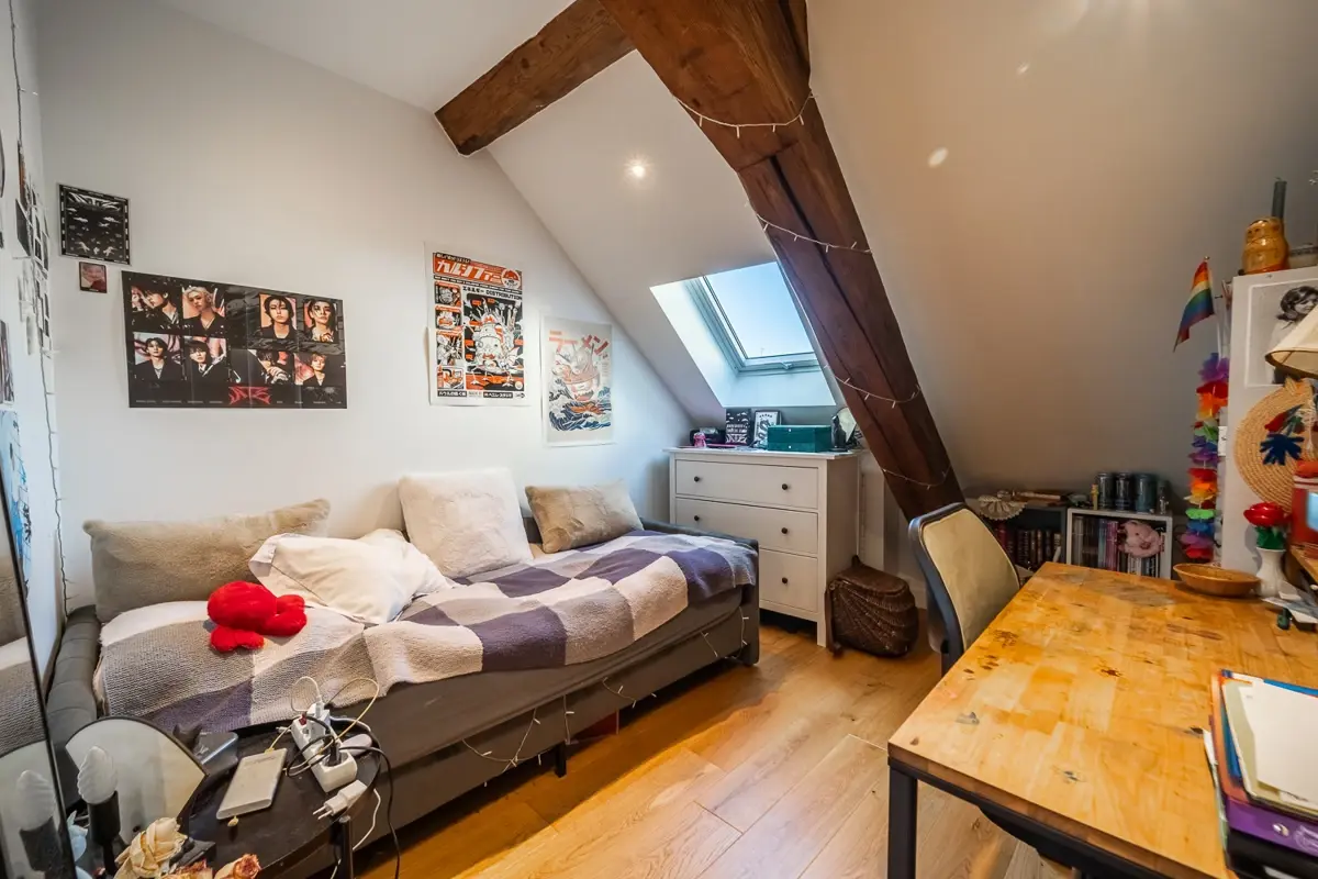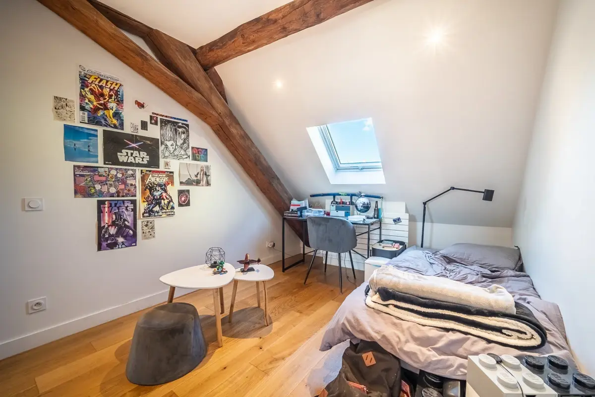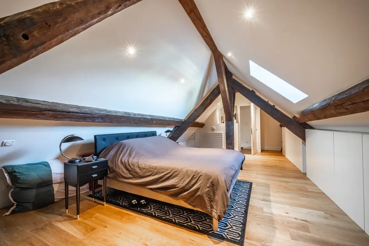 L'espace nuit comprend trois chambres confortables avec placards intégrés au niveau principal, accompagnées de deux salles d'eau dont l'une avec un W.C, un espace de rangement, une chaufferie et un W.C individuel. À l'étage, une vaste suite parentale sous les toits avec placards sur mesure, une troisième salle d'eau et un troisième W.C complètent l'ensemble.