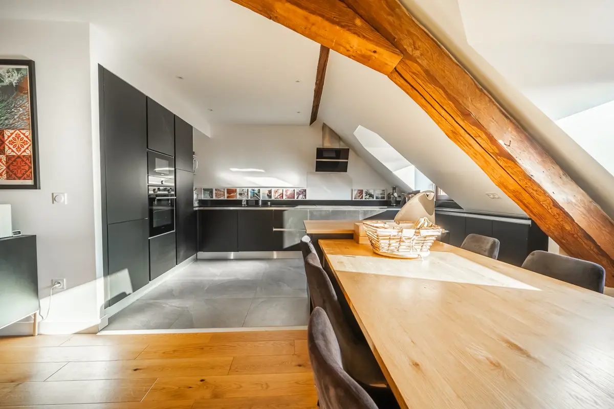 | 4 | Cuisine | 12.73 m2 | Sud | Cuisine haut de gamme avec plan de travail en granit, entièrement équipée. 10,77m2 au sens de la loi Carrez. |
