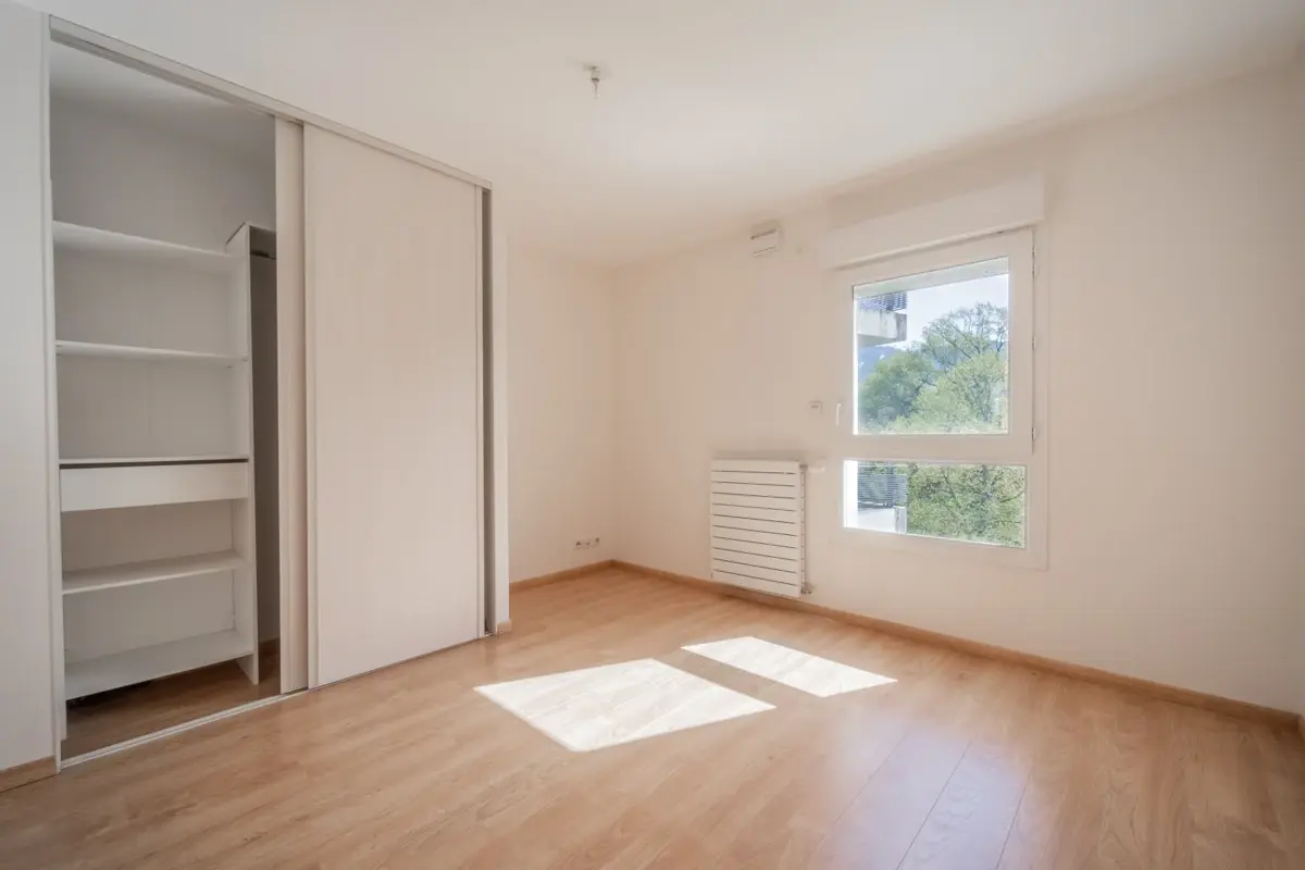 La pièce de vie, baignée de lumière, s’ouvre sur un spacieux balcon exposé plein sud, bénéficiant d’une vue dégagée sur le lac. La cuisine, ouverte sur le séjour, crée un espace convivial et fonctionnel.