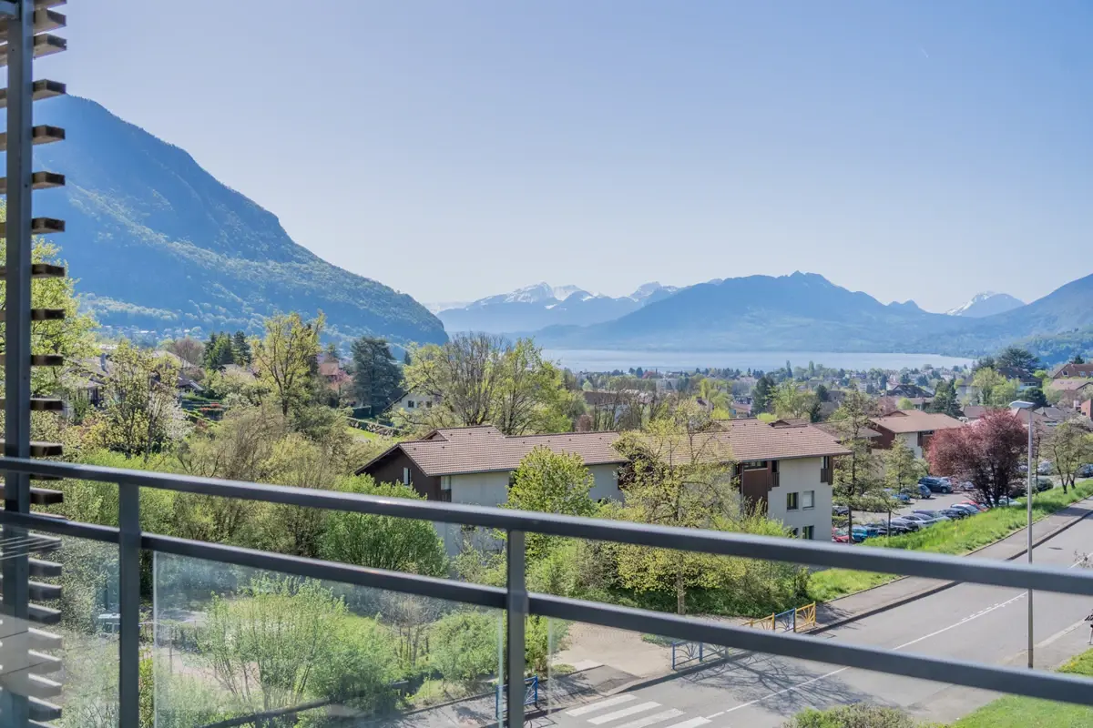 Terrasse privative, adaptée aux repas en extérieur et donnant sur une vue dégagée sur le lac d’Annecy.