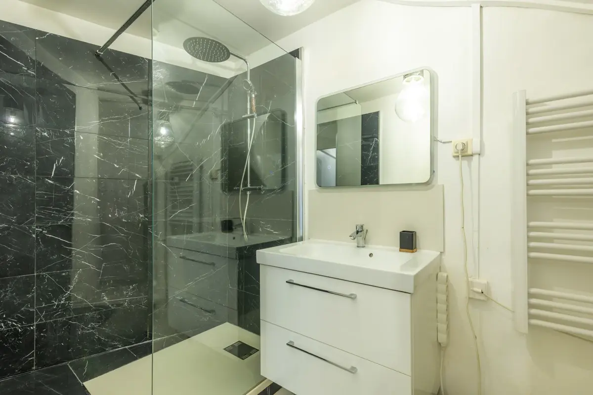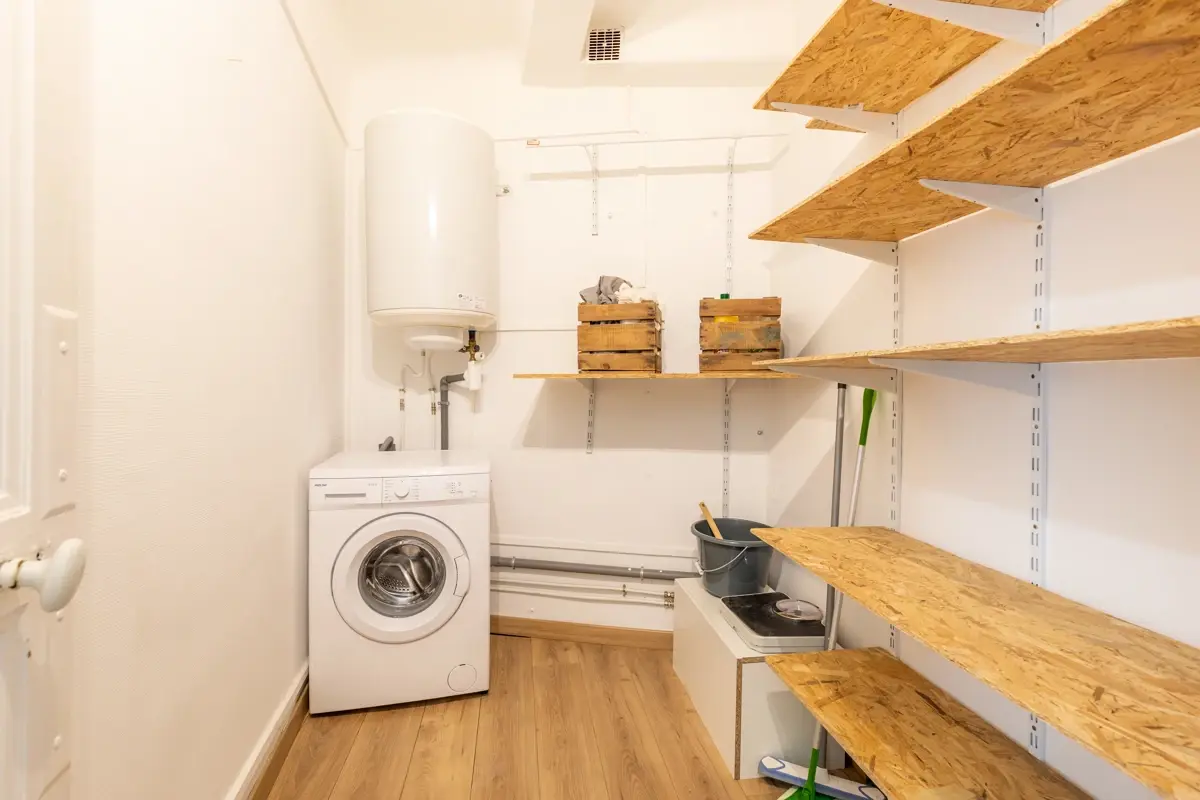 D'une surface totale d'environ 43m², l'appartement propose une cuisine ouverte sur un salon lumineux, une salle d'eau moderne équipée d'un sèche-serviette, d' une grande chambre avec deux fenêtres apportant une belle luminosité et d'une spacieuse buanderie.