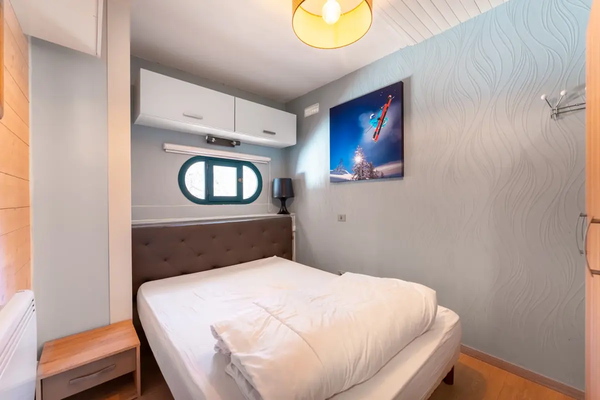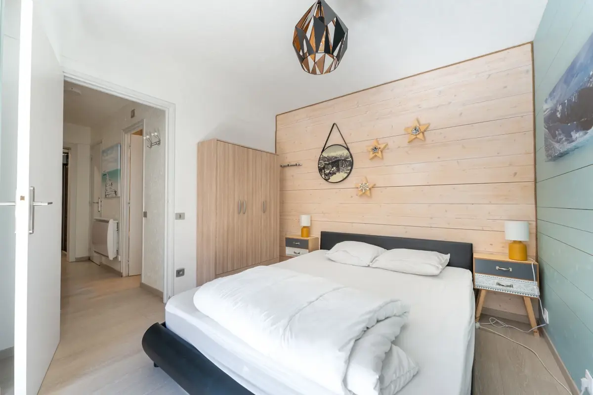 Cet appartement lumineux de 58m² offre un séjour-cuisine ouvert sur un balcon avec vue forêt et montagnes, et un salon avec accès à un balcon sud. La partie nuit comprend deux chambres doubles, dont une avec balcon supplémentaire. Trois balcons au total offrent une vue panoramique. Inclus, un box à ski et deux caves privatives pour le stockage.