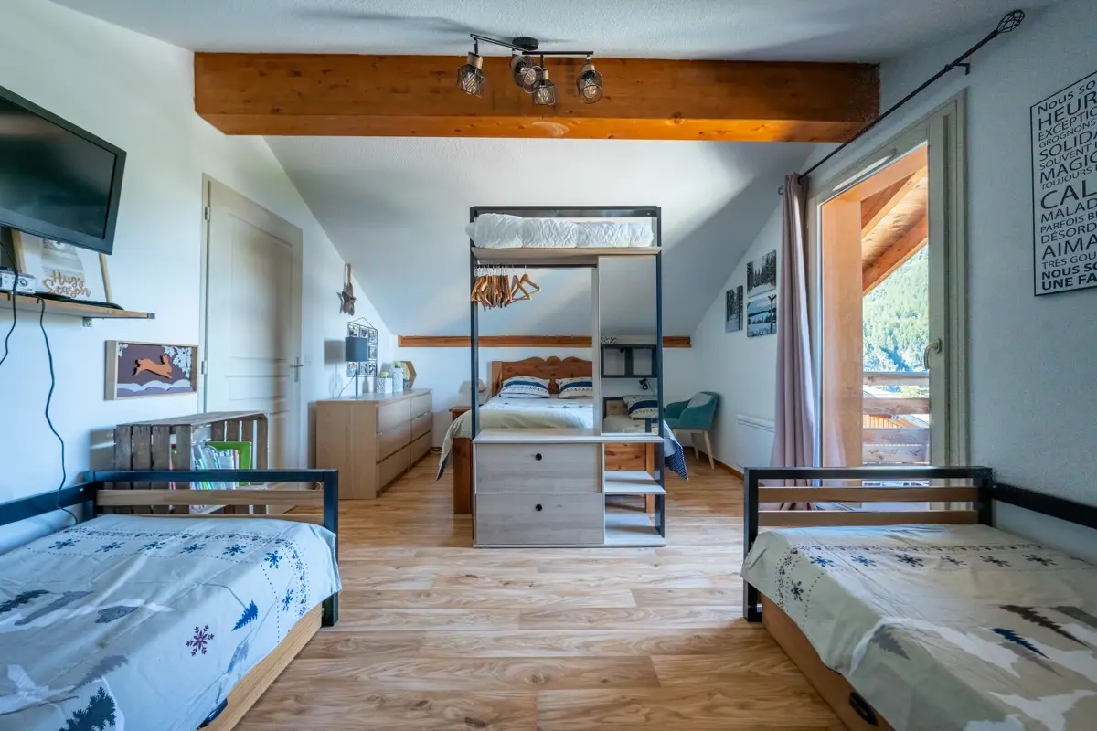 Au dernier étage avec ascenseur, ce duplex rénové d'une superficie habitable de 62m² (54m² loi carrez) propose un séjour ouvert sur une cuisine moderne. Une chambre ouverte sur le séjour agrémente ce niveau. À l'étage, une grande chambre est aménagée avec un lit double et deux lits gigognes, ainsi qu'un coin montagne avec possibilité d'y installer un canapé-lit. L'appartement comprend également deux salles de bain et deux WC. Capacité d'accueil de 8 à 10 personnes.