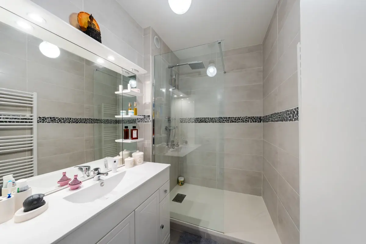 🛋️ Description intérieure : Cet appartement de 58 m² en parfait état se distingue par ses prestations soignées et son agencement optimisé. La pièce de vie lumineuse s’ouvre sur une belle véranda donnant sur un jardin privatif, idéal pour profiter des beaux jours. La cuisine, semi-ouverte, offre un espace fonctionnel et convivial. Un cellier et de nombreux placards offrent des espaces de rangement très appréciables. Chauffage collectif par le sol, climatisation, aucun travaux à prévoir.