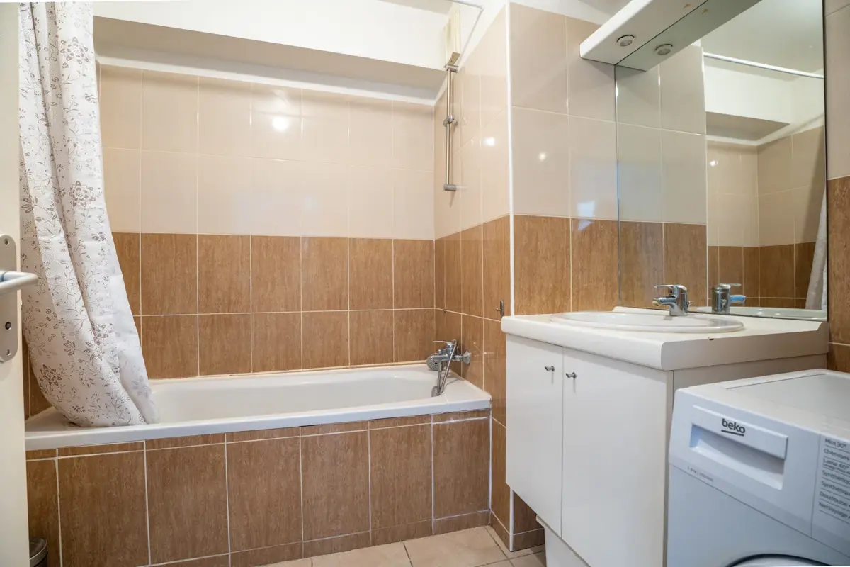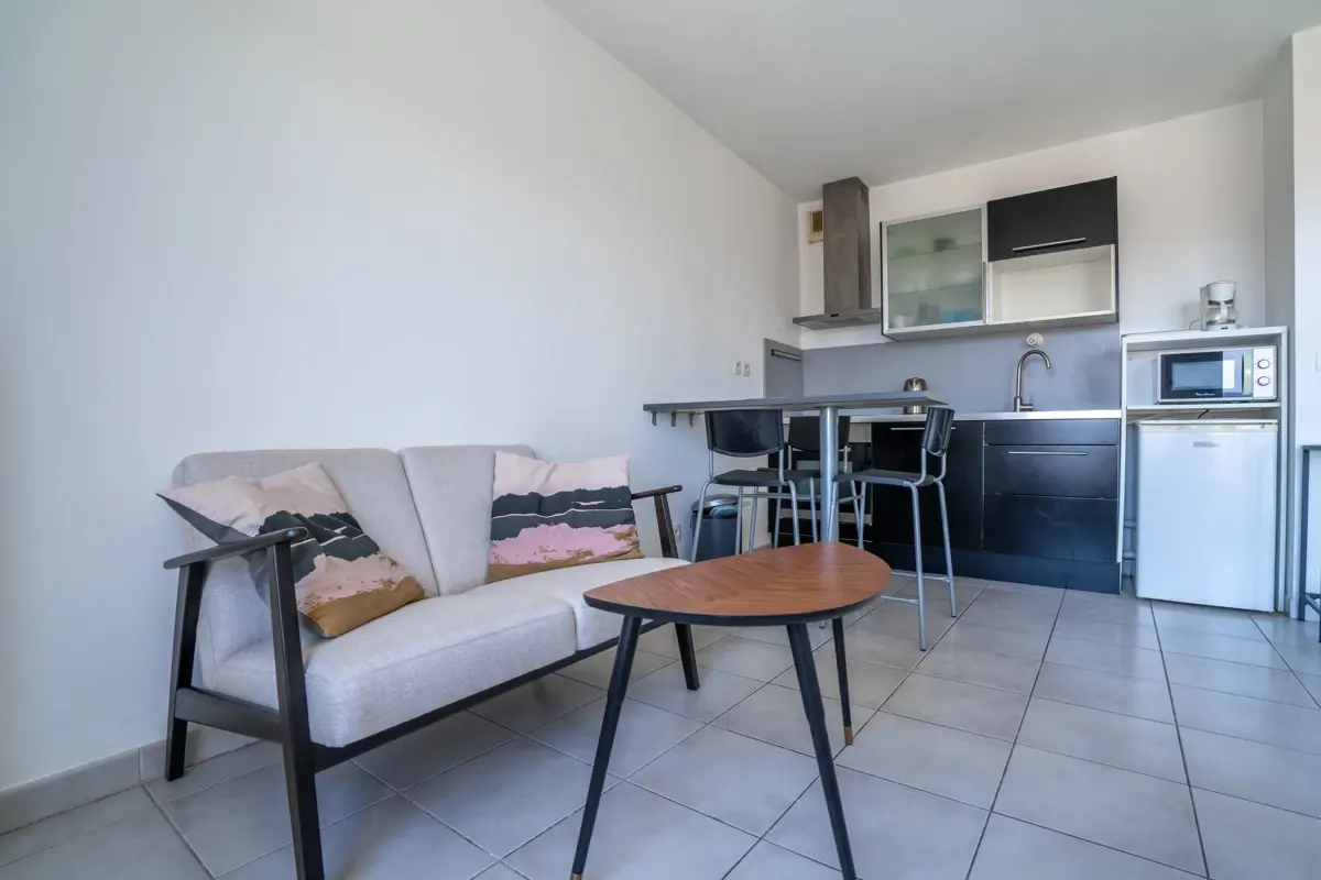 Cet appartement de 39m² comprend une pièce de vie lumineuse avec cuisine ouverte, une terrasse sans vis-à-vis, une chambre avec placard, une salle de bain avec baignoire et un WC indépendant. La résidence offre également un ascenseur.