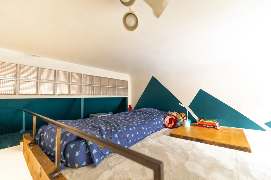 L’espace nuit orienté EST est composé d’une chambre avec salle de bain attenante donnant sur le séjour, d’une deuxième chambre avec mezzanine, et un escalier vient desservir une 3ème chambre.