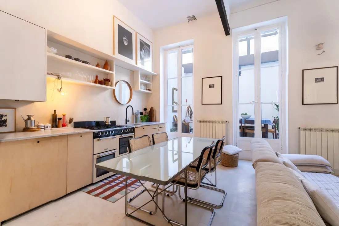 Le séjour est composé d'une cuisine équipée ouverte sur le salon, une touche de marbre de Carrare, cheminée décorative, béton ciré au sol, et profite de trois belles ouvertures. L'ensemble s'ouvre sur l'espace extérieur de 24 m2, fermé par une verrière signée Gustave Eiffel, un bijou architectural !