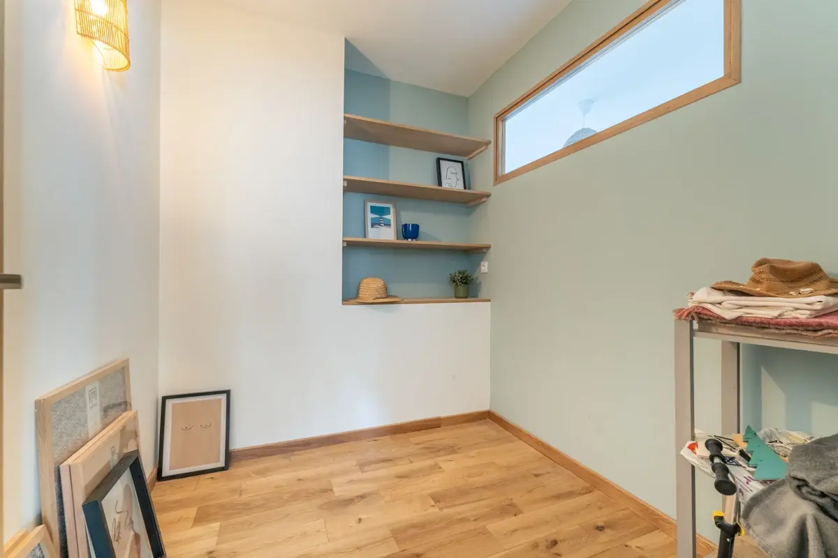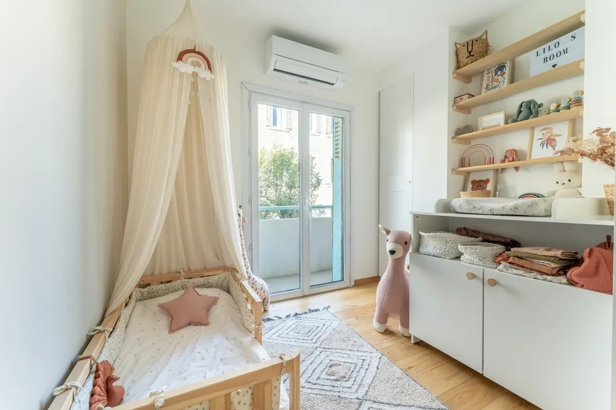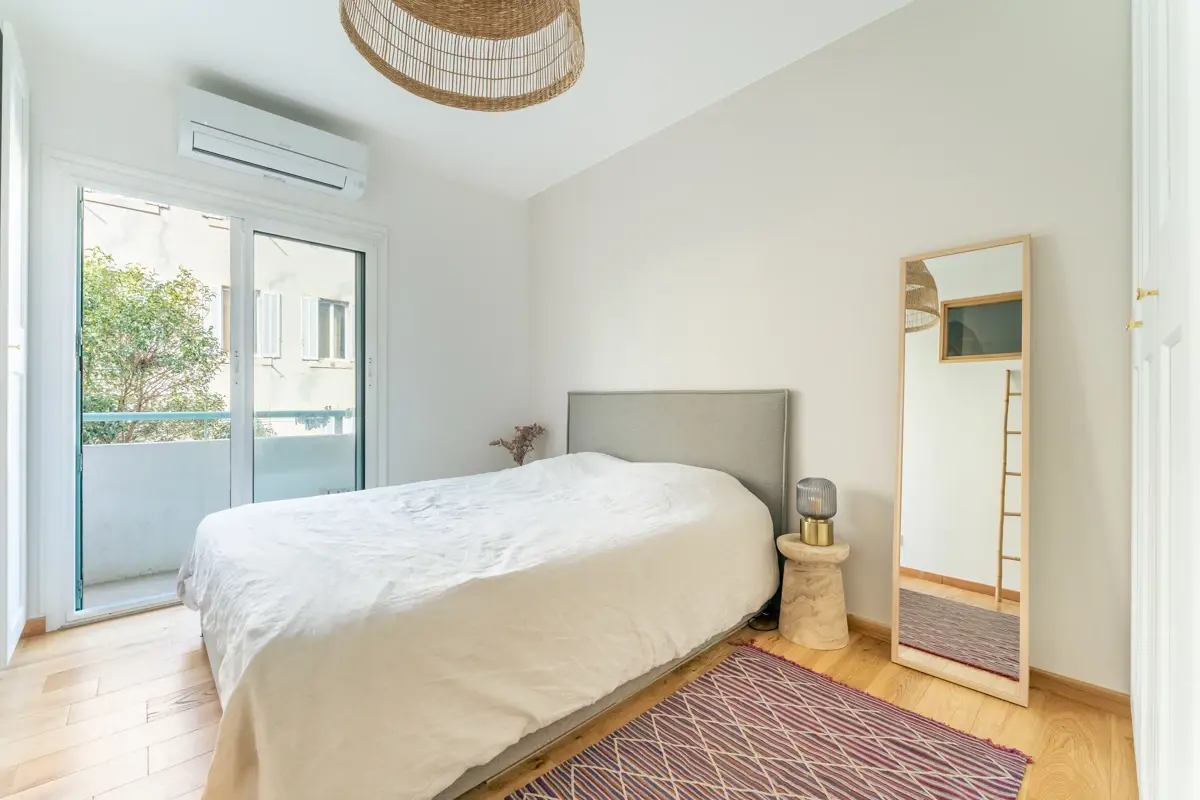 L'appartement possède deux chambres ayant un accès à un second balcon donnant sur une cour arborée et calme. Se trouvent également une autre pièce pouvant servir de chambrette/bureau ainsi qu'une salle d'eau avec wc.