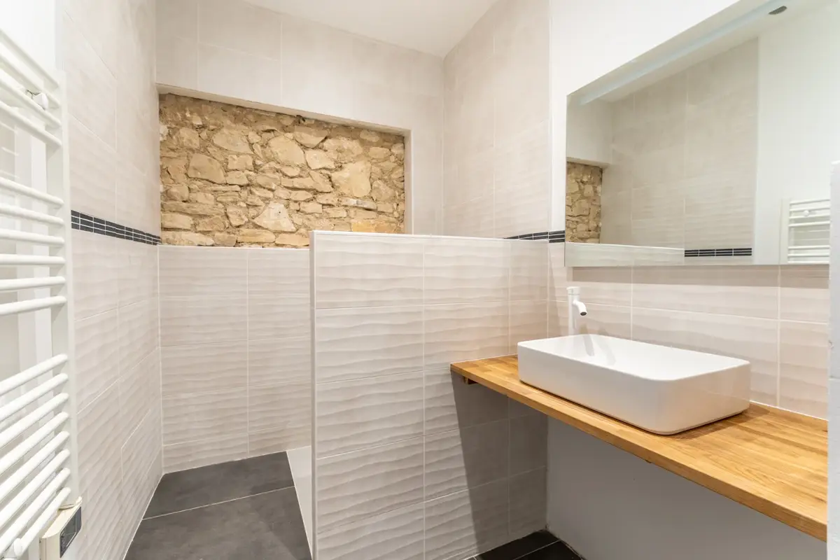 Cet appartement met en avant tous les codes du charme de l'ancien, alliant ainsi une belle hauteur sous plafond, des cheminées, un mur en pierre et de belles tomettes !