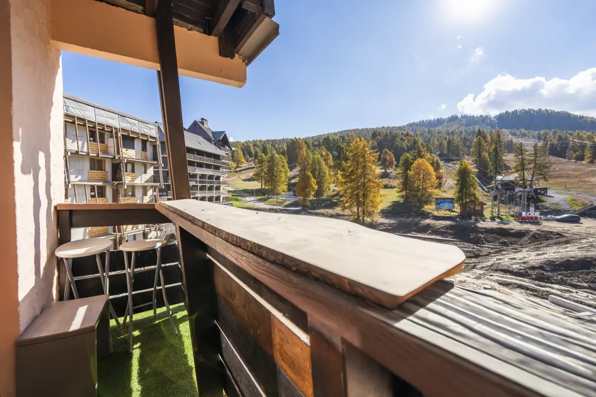 Un balcon ensoleillé offrant une vue sur les pistes de ski, où vous pourrez apprécier la vie de la station et profiter en toute quiétude.