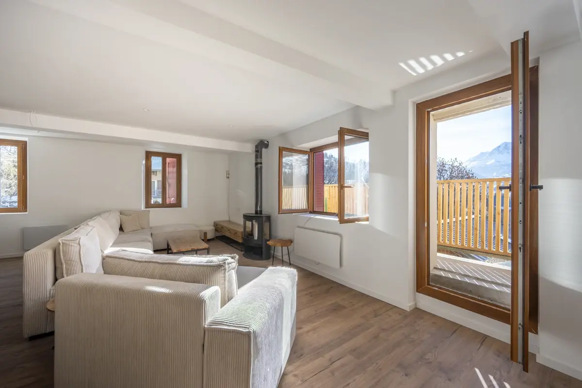 Le séjour ouvre sur une terrasse de 8 m2 plein sud avec vue dégagée sur les montagnes.