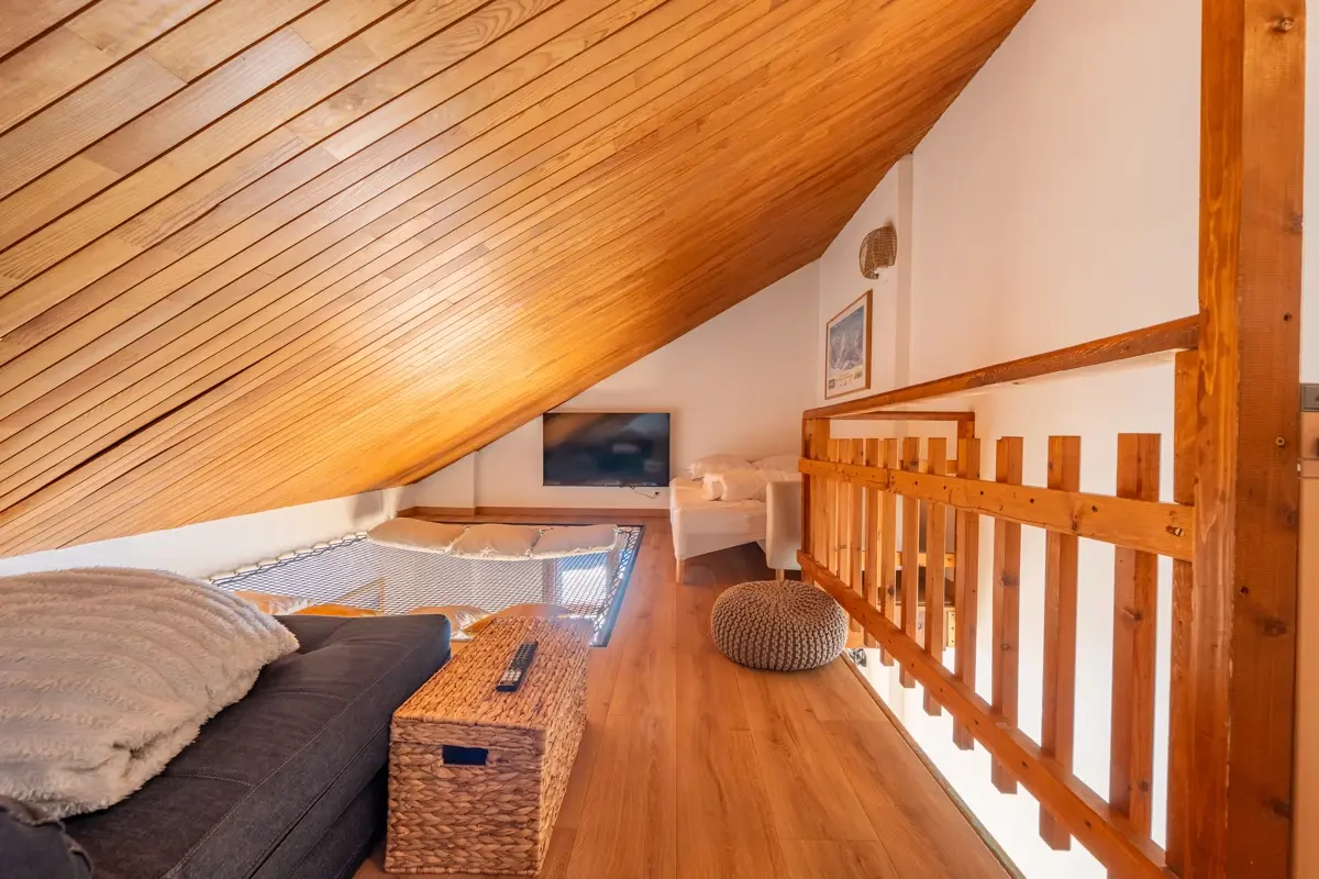 A l'étage , on retrouve une grande chambre et sa salle de bain avec wc ainsi qu'un espace ludique et original tenant lieu de salon de détente , télévision...