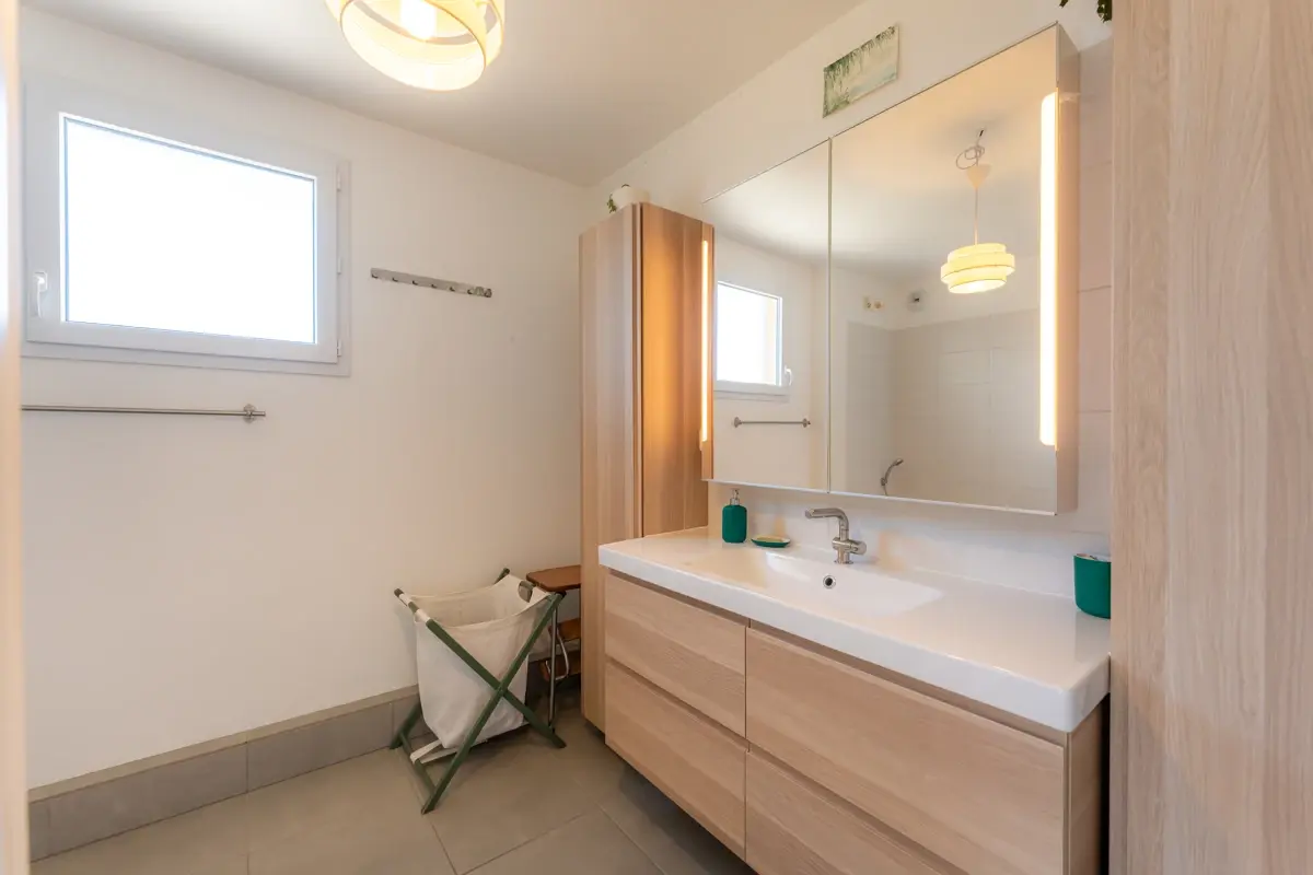 Cet appartement de 88 m², construit en 2019, allie modernité et fonctionnalité. Son agencement spacieux et lumineux comprend : • Un séjour ouvert sur une cuisine équipée (four, plaques de cuisson, hotte, lave-vaisselle), • Une salle à manger indépendante, • Trois chambres avec placards, • Une salle d’eau, une salle de bain et un WC séparé.
