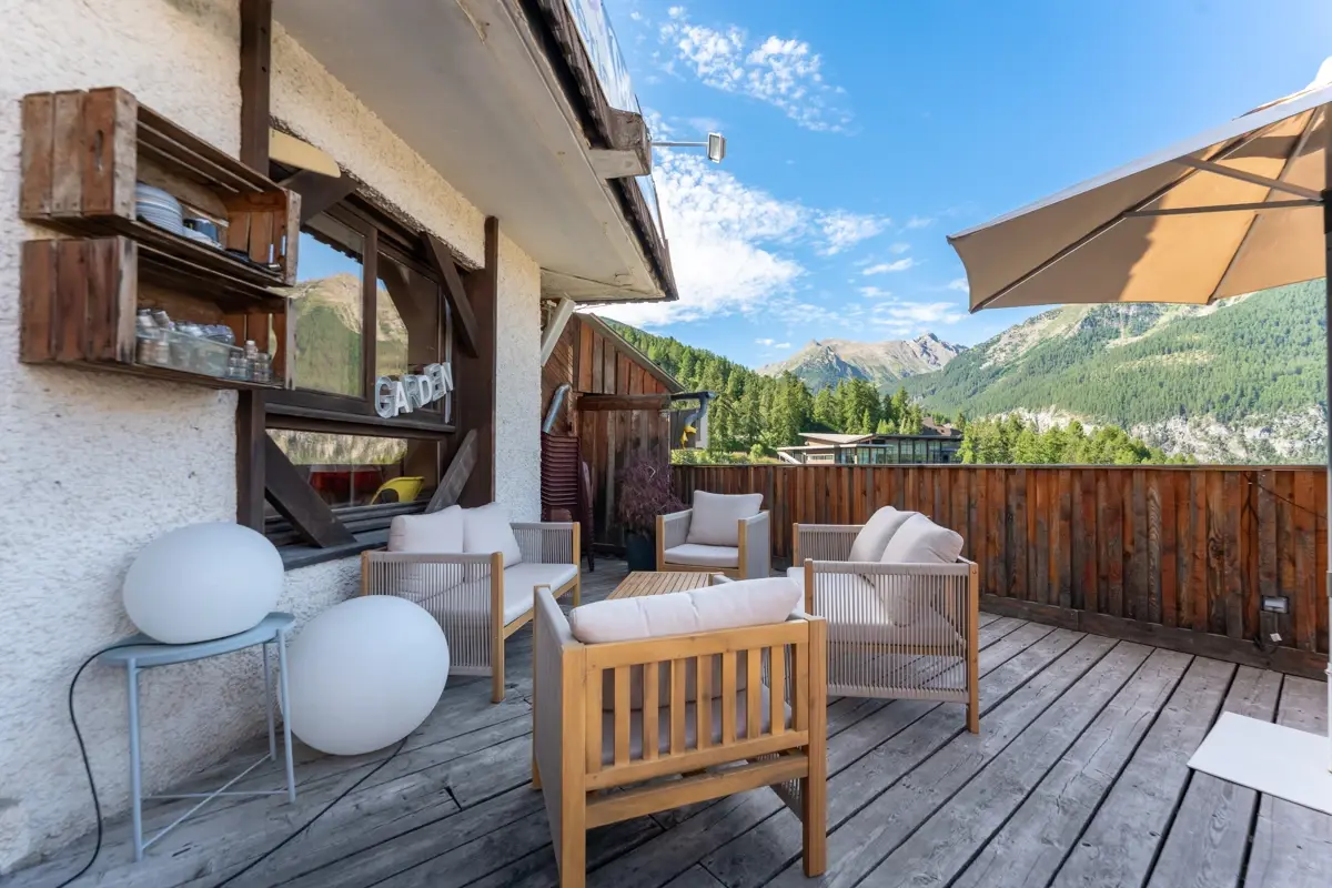 La grande terrasse de 200m² offre un espace extérieur généreux permettant de profiter du paysage, de l’ensoleillement et des vues sur la station.