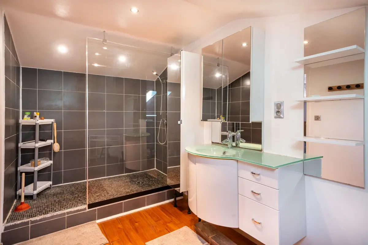 L’espace nuit, réparti sur deux niveaux, offre 6 chambres : une suite parentale avec dressing dans l’une des habitations et cinq chambres modulables dans l’autre. Deux salles de bains complètent l’ensemble.