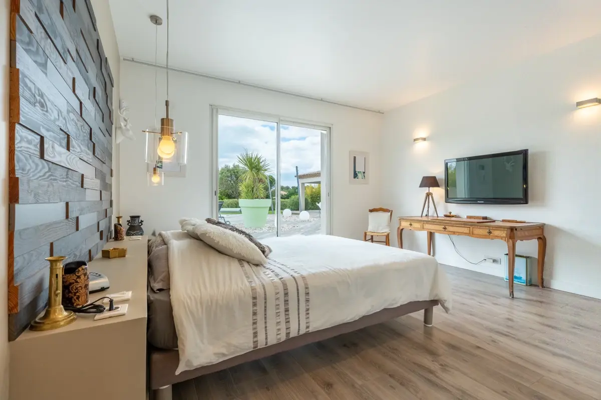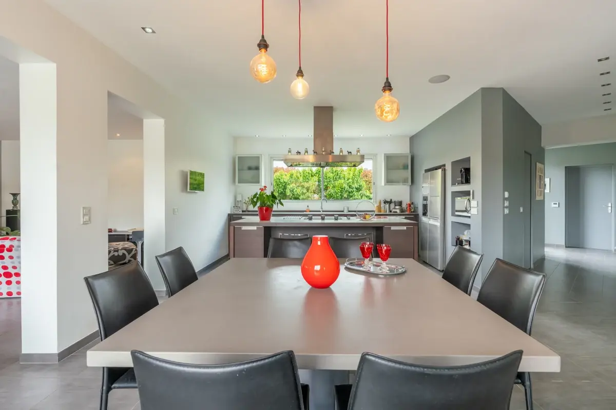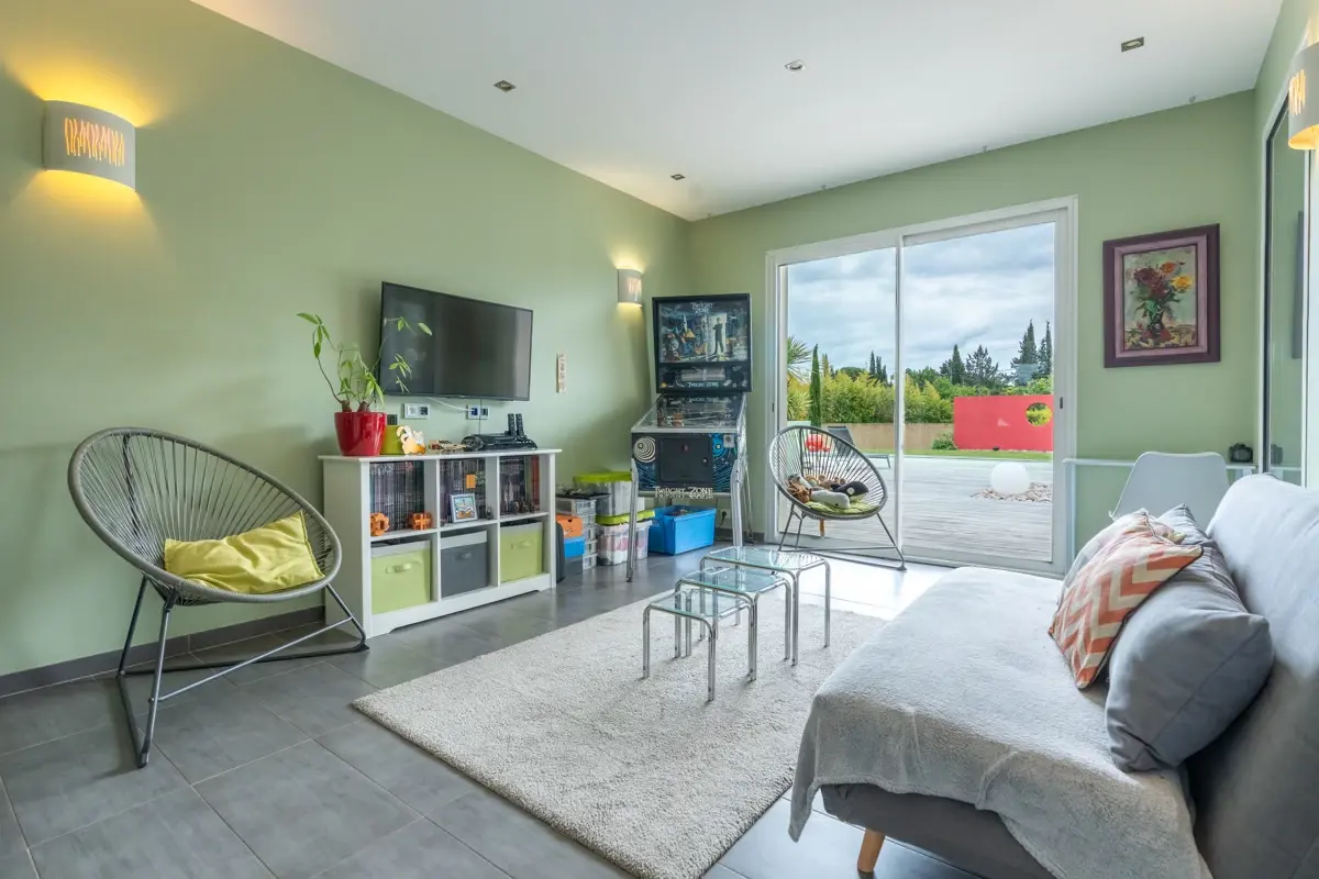 La maison, d'environ 260m², s'ouvre sur une grande pièce de vie lumineuse avec une cuisine aménagée. Elle est aménagée pour offrir confort et fonctionnalité.