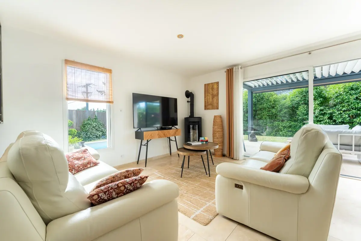 Le jardin de 740 m² est composé d'une terrasse abritée par une pergola bioclimatique ainsi que d'une piscine de 3x6 m.