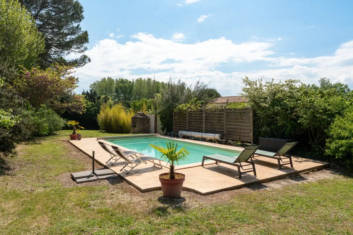Maison de plain-pied entièrement rénovée, climatisée, avec salon-séjour spacieux, cuisine semi-ouverte, trois chambres dont une suite parentale, deux salles d'eau, piscine, et garage transformable en studio, le tout sur un grand terrain.