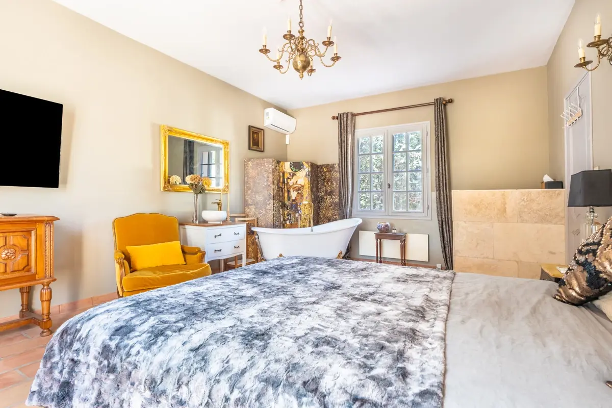 Les 305 m² habitables comprennent un séjour lumineux agrémenté d’une cheminée, une cuisine contemporaine entièrement aménagée et une terrasse exposée plein sud. La maison se compose de 4 suites climatisées avec salles d’eau privatives, ainsi que de 2 appartements indépendants. S’y ajoutent deux roulottes aménagées, une extension de 40 m² reliée à la bâtisse principale et une dépendance autonome de 30 m².