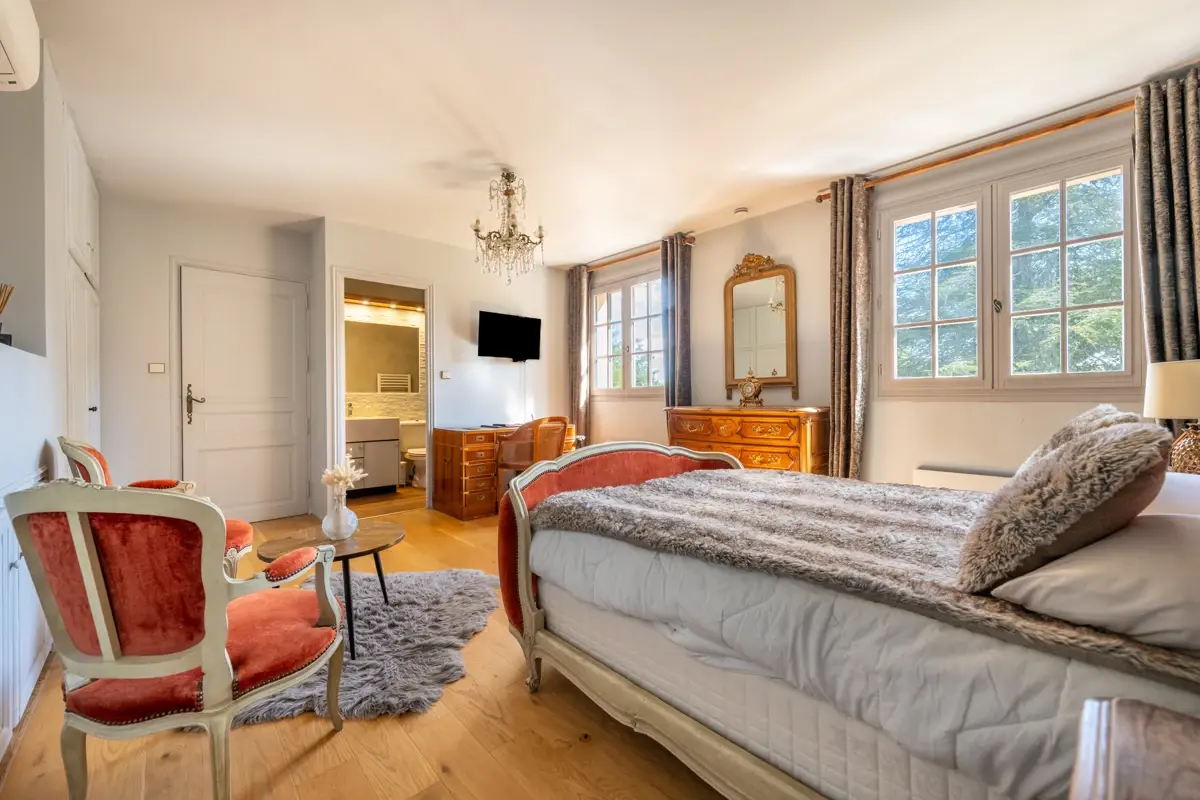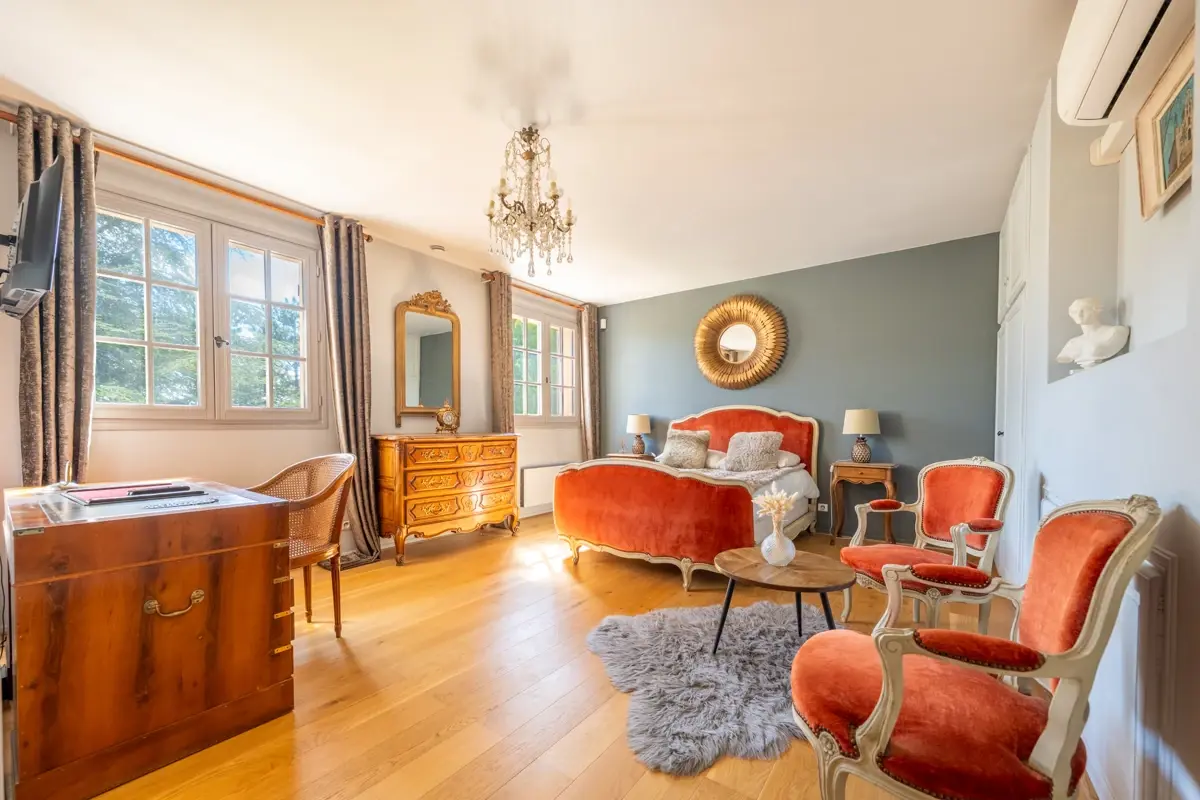 Implanté sur un parc arboré de 11 400 m², le bien dispose d'une piscine privée, d'un pool house, et de trois jacuzzis professionnels.