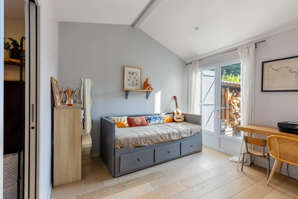 Au rez-de-chaussée, un espace de vie comprenant un salon avec insert et une salle à manger s'ouvre sur une cuisine moderne entièrement équipée. Ce niveau offre également une chambre avec salle d'eau privative et WC, ainsi qu'une véranda lumineuse avec rangements muraux. L'ensemble est complété par des toilettes indépendantes.