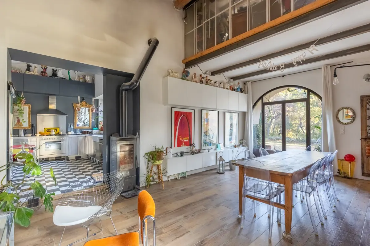 S'étendant sur 145 m² habitables, la maison propose un vaste espace de vie. Le salon, agrémenté d'un poêle, s'ouvre sur une cuisine atelier authentique, prolongée par une terrasse abritée. Le rez-de-chaussée comprend deux chambres confortables, une salle de douche partagée et des toilettes invités. À l'étage, une suite parentale sous combles inclut une spacieuse salle de bains avec baignoire et douche à l'italienne, ainsi qu'un dressing et un espace bureau atelier.