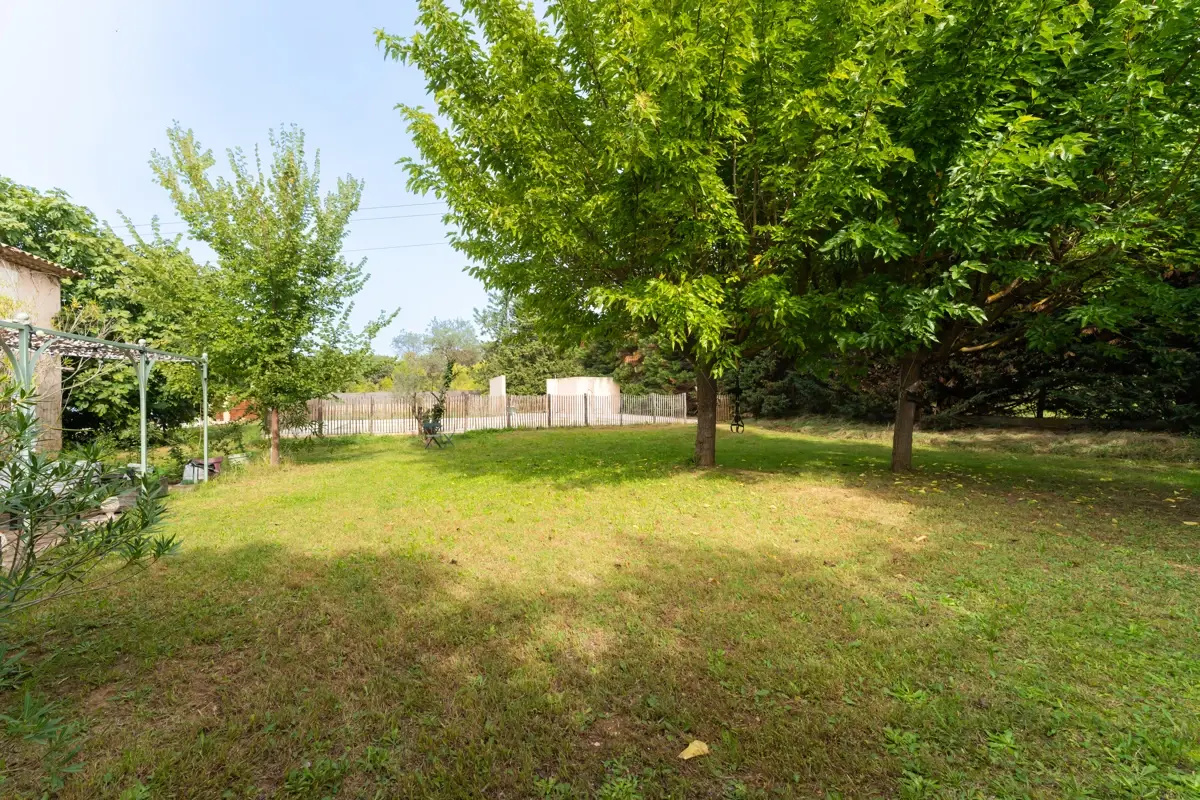 Profitez d'un espace piscine avec plage, entouré d'un terrain clos et arboré. Un auvent ombragé et un garage fermé créent de nombreux rangements supplémentaires.