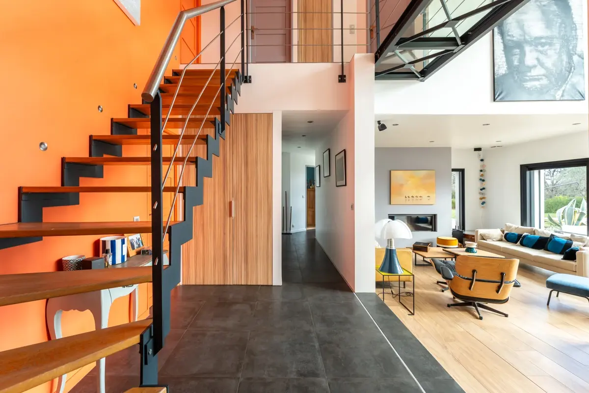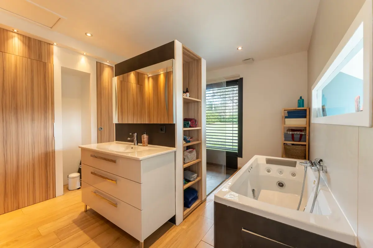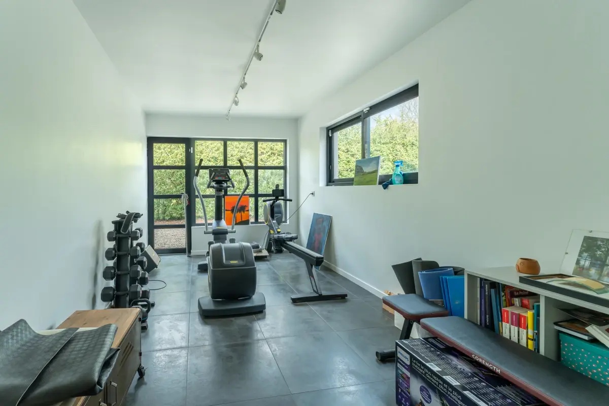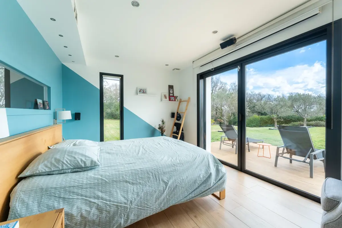Au rez-de-chaussée, une entrée dessert un double séjour et une cuisine orientés plein sud grâce à de larges baies vitrées. La maison propose un espace nuit avec 2 suites de plain-pied, dont une suite parentale équipée d'une salle de bains avec douche, ainsi qu'une salle de sport. À l'étage, vous trouverez 2 suites supplémentaires, une vaste salle de jeux modulable en dortoir ou cinquième chambre, et un bureau. La maison est équipée de nombreux rangements, d'un système de climatisation et de chauffage au sol, de la domotique ainsi que de la sécurité avec alarme et vidéosurveillance.