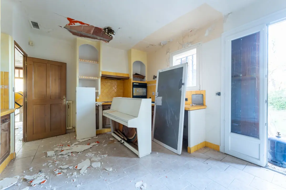 Maison d’environ 262 m² habitables à rénover intégralement. Belle pièce de vie lumineuse avec larges baies donnant sur la terrasse et le jardin. Cuisine indépendante avec grand cellier. Rénovation à prévoir pour moderniser les espaces et les installations.