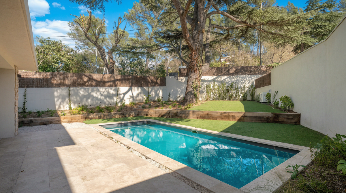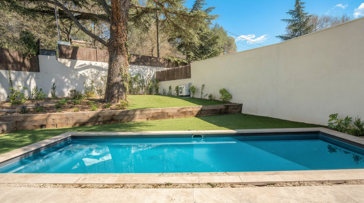La propriété s’étend sur 500 m² et bénéficie d’un jardin paysager avec piscine chauffée de 9m x 3m, idéale pour les moments de détente ou les baignades en famille. Une terrasse en bois complète l’espace extérieur, parfait pour les repas en extérieur ou les soirées estivales. L’arrosage automatique et l’éclairage paysager ajoutent une touche de modernité et de praticité.