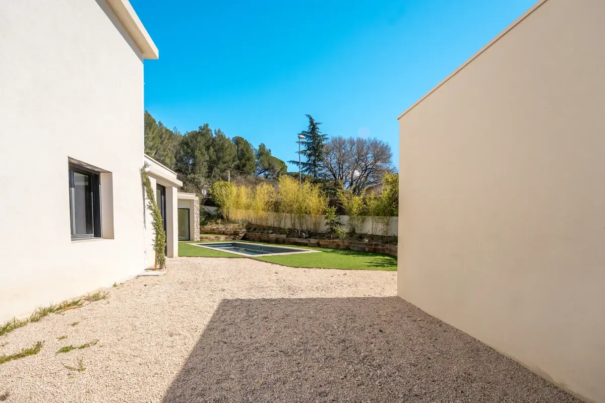Le terrain paysager de 500 m² offre un cadre verdoyant et clos, propice à la détente. Une piscine chauffée (9 × 3 m) et une terrasse exposée plein sud invitent aux moments de convivialité en extérieur. Le jardin, entretenu et sécurisé, complète ce cadre de vie idyllique.