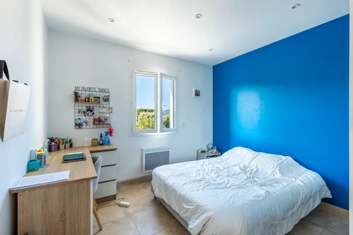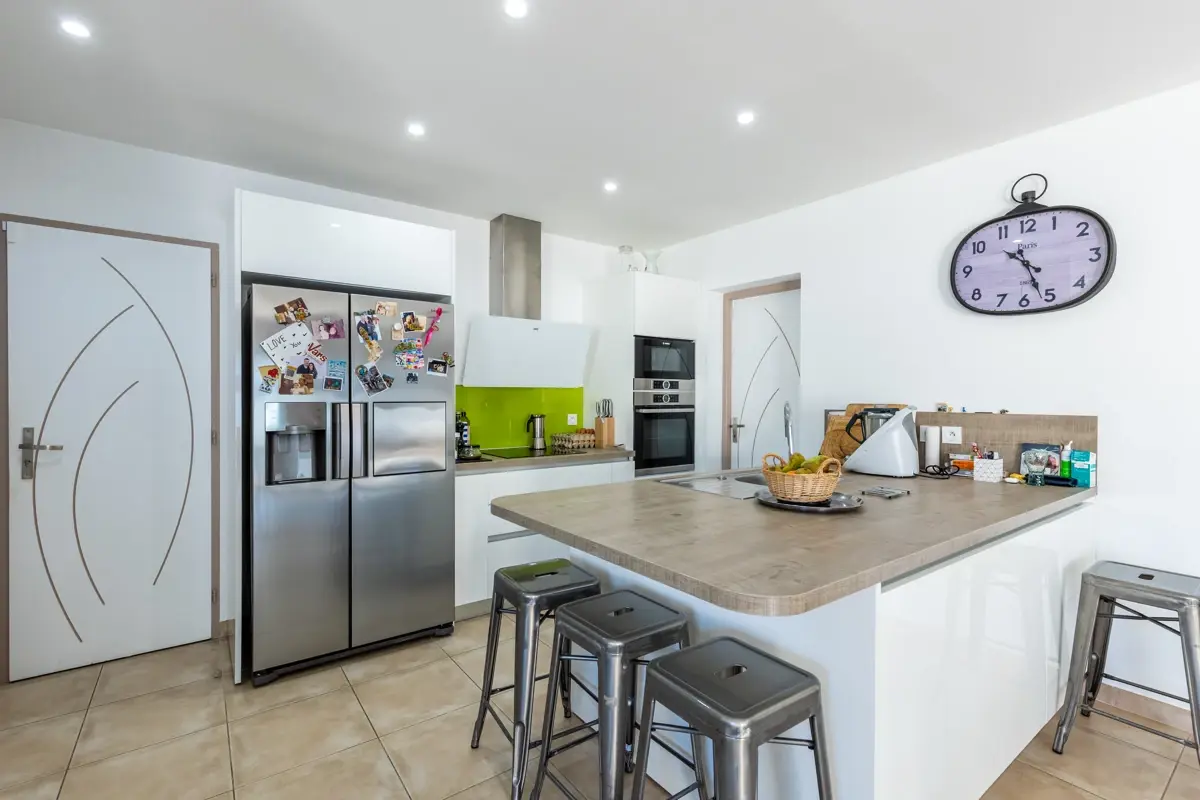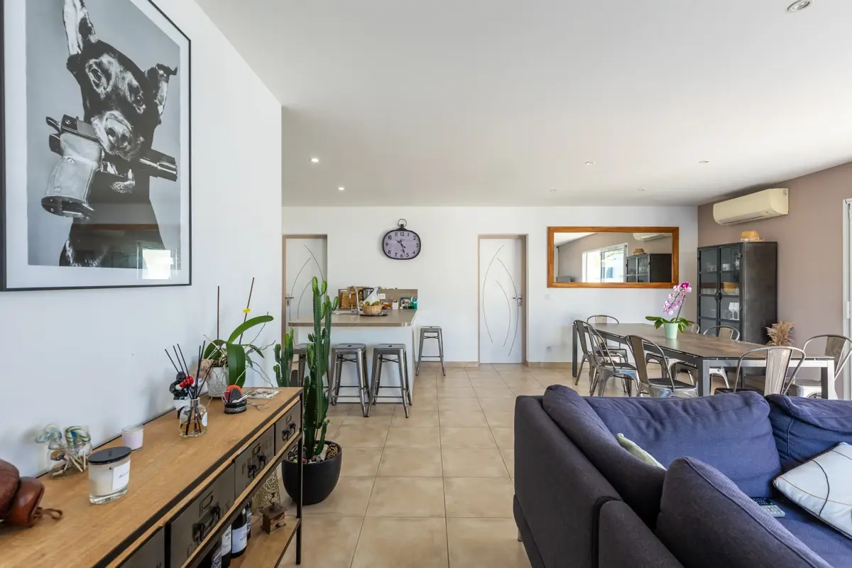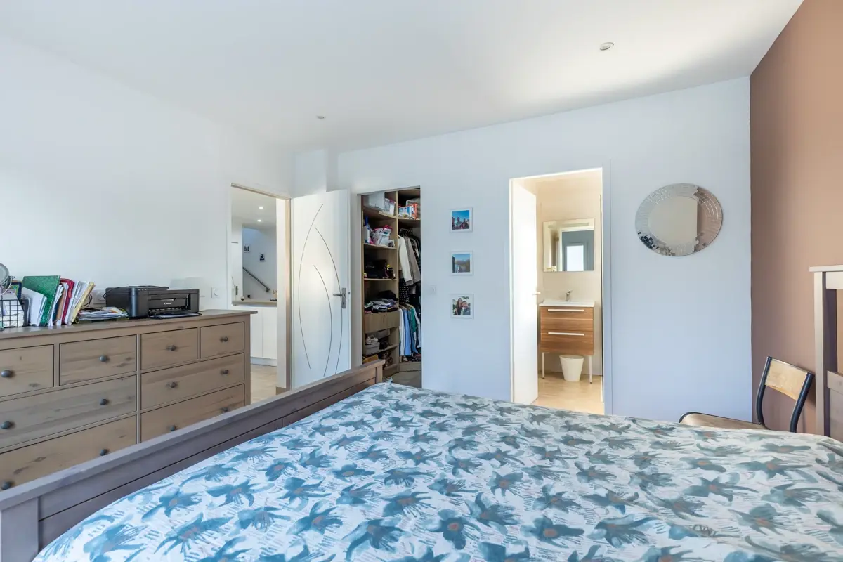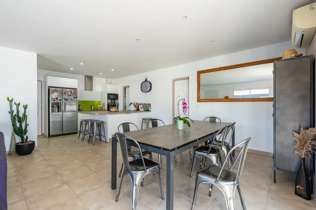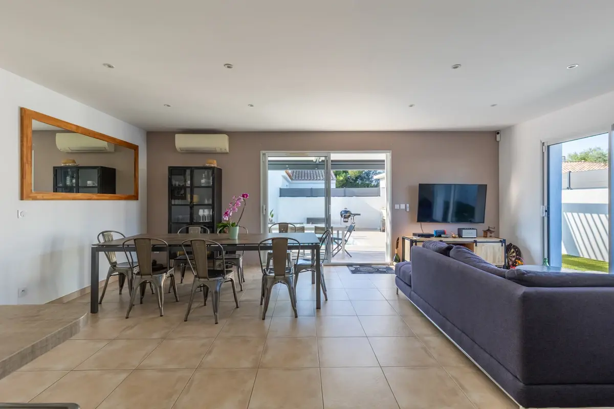 Cette maison de 2018, totalisant environ 140 m², propose un vaste séjour lumineux avec cuisine équipée adjacente et un cellier. Le rez-de-chaussée dispose également d'une suite parentale avec dressing, salle d'eau et WC indépendant. À l'étage, trois chambres, une salle de bain et un WC indépendant forment un espace nuit bien agencé. La maison est équipée de la climatisation réversible et de volets roulants électriques centralisés.
